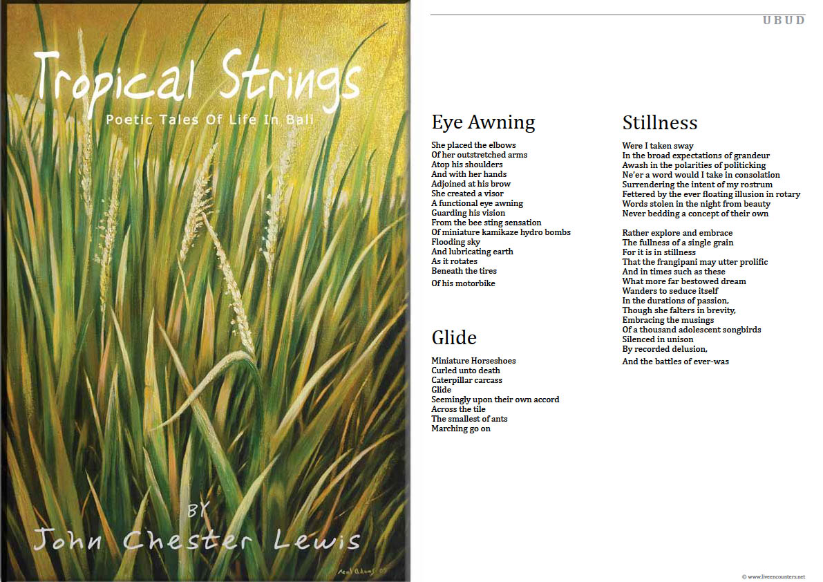 John Chester Lewis was born in Southern California and began writing poetry during university in Colorado. Presently he lives in Ubud, Bali, Indonesia where he works on his poetry, music, and painting, when not running JL Galleries fine art. Three more books of poetry are due to be released in 2010.