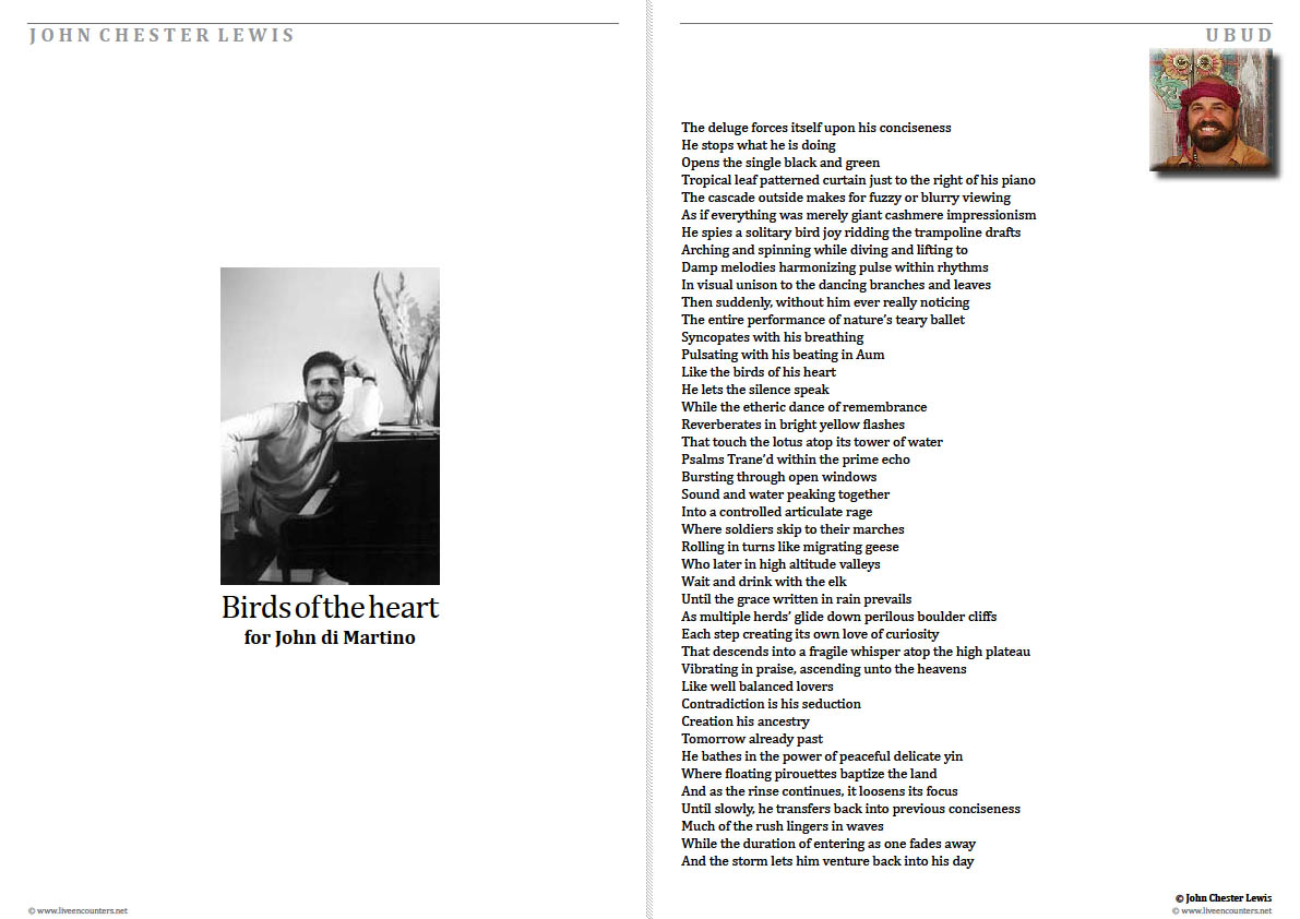 John Chester Lewis was born in Southern California and began writing poetry during university in Colorado. Presently he lives in Ubud, Bali, Indonesia where he works on his poetry, music, and painting, when not running JL Galleries fine art.Three more books of poetry are due to be released in 2010.