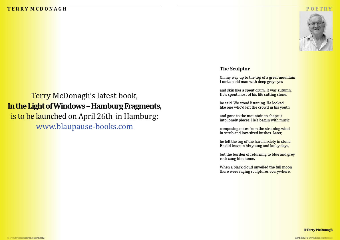 Irish poet and dramatist, Terry McDonagh, www.terry-mcdonagh.com, taught creative writing at the University of Hamburg and was Drama Director at the Int. School Hamburg for 15 years, He now works freelance. He has been writer in residence in Europe, Asia and Australia. He’s published seven poetry collections, a book of letters, as well as prose and poetry for young people Translated into Indonesian and German and distributed internationally by Syracuse Uni. Press. His latest poetry collection: Ripple Effect in due for publication in May/June 2013 – Arlen House, and his next children’s story, Michel the Merman, illustrated by Marc Barnes (NZ), is to be published in September 2013. He lives in Hamburg and Ireland.
