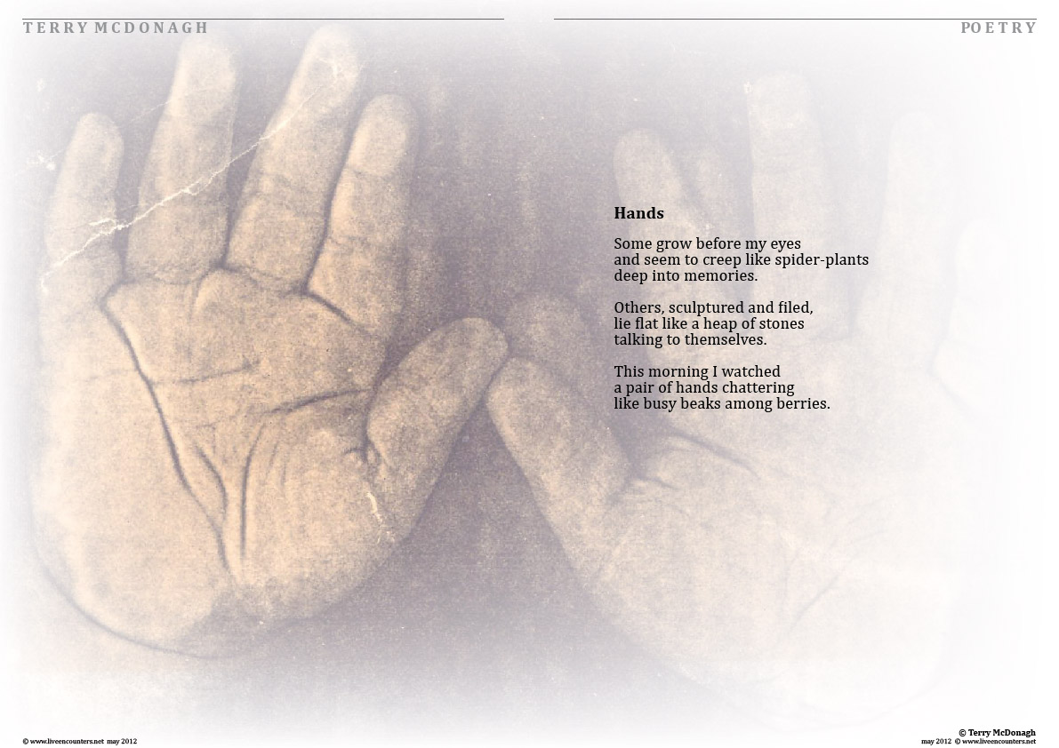 Irish poet and dramatist, Terry McDonagh, www.terry-mcdonagh.com, taught creative writing at the University of Hamburg and was Drama Director at the Int. School Hamburg for 15 years. He now works freelance. He has been writer in residence in Europe, Asia and Australia. He’s published seven poetry collections, a book of letters, as well as prose and poetry for young people Translated into Indonesian and German and distributed internationally by Syracuse Uni. Press. His latest poetry collection: Ripple Effect in due for publication in May/June 2013 – Arlen House, and his next children’s story, Michel the Merman, illustrated by Marc Barnes (NZ), is to be published in September 2013. He lives in Hamburg and Ireland.