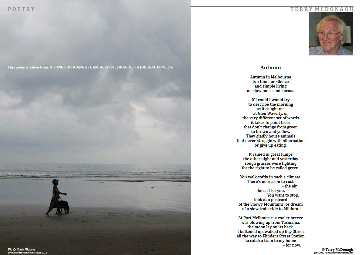 Irish poet and dramatist, Terry McDonagh, www.terry-mcdonagh.com, taught creative writing at the University of Hamburg and was Drama Director at the Int. School Hamburg for 15 years. He now works freelance. He has been writer in residence in Europe, Asia and Australia. He’s published seven poetry collections, a book of letters, as well as prose and poetry for young people Translated into Indonesian and German and distributed internationally by Syracuse Uni. Press. His latest poetry collection: Ripple Effect in due for publication in May/June 2013 – Arlen House, and his next children’s story, Michel the Merman, illustrated by Marc Barnes (NZ), is to be published in September 2013. He lives in Hamburg and Ireland.