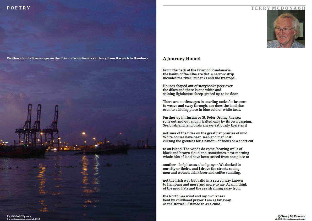 Irish poet and dramatist, Terry McDonagh, www.terry-mcdonagh.com, taught creative writing at the University of Hamburg and was Drama Director at the Int. School Hamburg for 15 years, He now works freelance. He has been writer in residence in Europe, Asia and Australia. He’s published seven poetry collections, a book of letters, as well as prose and poetry for young people translated into Indonesian and German and distributed internationally by Syracuse Uni. Press. His latest poetry collection: Ripple Effect in due for publication in May/June 2013 – Arlen House, and his next children’s story, Michel the Merman, illustrated by Marc Barnes (NZ), is to be published in September 2013. He lives in Hamburg and Ireland.