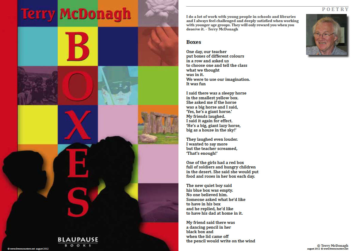 Irish poet and dramatist, Terry McDonagh, www.terry-mcdonagh.com, taught creative writing at the University of Hamburg and was Drama Director at the Int. School Hamburg for 15 years, He now works freelance. He has been writer in residence in Europe, Asia and Australia. He’s published seven poetry collections, a book of letters, as well as prose and poetry for young people translated into Indonesian and German and distributed internationally by Syracuse Uni. Press. His latest poetry collection: Ripple Effect in due for publication in May/June 2013 – Arlen House, and his next children’s story, Michel the Merman, illustrated by Marc Barnes (NZ), is to be published in September 2013. He lives in Hamburg and Ireland.
