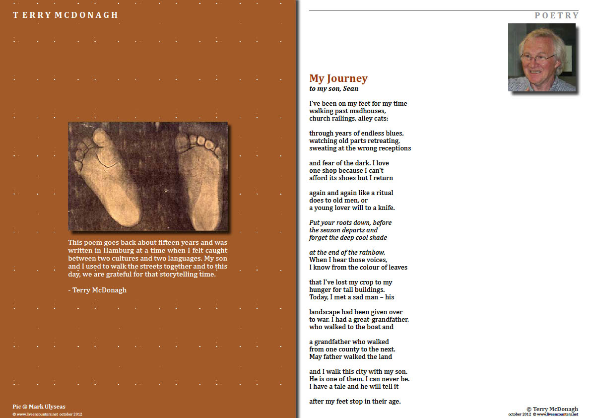 Irish poet and dramatist, Terry McDonagh, www.terry-mcdonagh.com, taught creative writing at the University of Hamburg and was Drama Director at the Int. School Hamburg for 15 years, He now works freelance. He has been writer in residence in Europe, Asia and Australia. He’s published seven poetry collections, a book of letters, as well as prose and poetry for young people Translated into Indonesian and German and distributed internationally by Syracuse Uni. Press. His latest poetry collection: Ripple Effect in due for publication in May/June 2013 – Arlen House, and his next children’s story, Michel the Merman, illustrated by Marc Barnes (NZ), is to be published in September 2013. He lives in Hamburg and Ireland.
