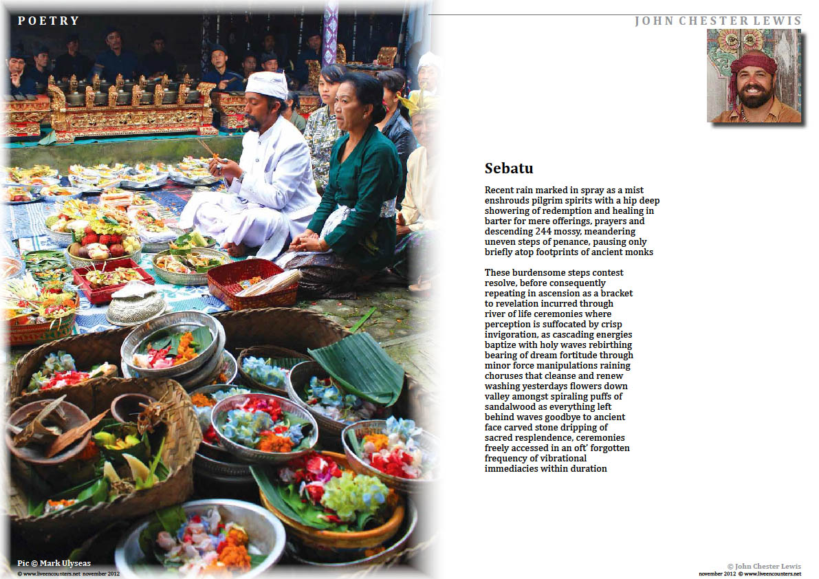 John Chester Lewis was born in Southern California and began writing poetry during university in Colorado. Presently he lives in Ubud, Bali, Indonesia where he works on his poetry, music, and painting, when not running JL Galleries fine art. Three more books of poetry are due to be released in 2010.