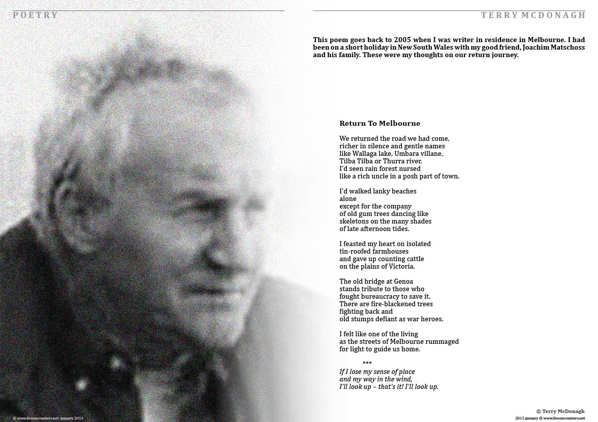 Irish poet and dramatist, Terry McDonagh, www.terry-mcdonagh.com, taught creative writing at the University of Hamburg and was Drama Director at the Int. School Hamburg for 15 years, He now works freelance. He has been writer in residence in Europe, Asia and Australia. He’s published seven poetry collections, a book of letters, as well as prose and poetry for young people Translated into Indonesian and German and distributed internationally by Syracuse Uni. Press. His latest poetry collection: Ripple Effect in due for publication in May/June 2013 – Arlen House, and his next children’s story, Michel the Merman, illustrated by Marc Barnes (NZ), is to be published in September 2013. He lives in Hamburg and Ireland.