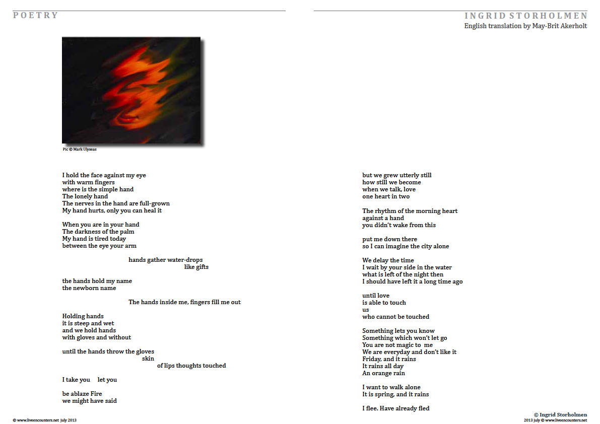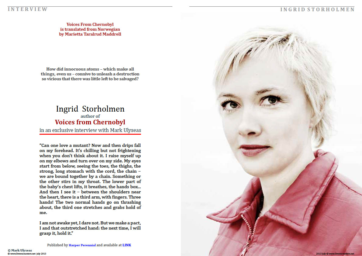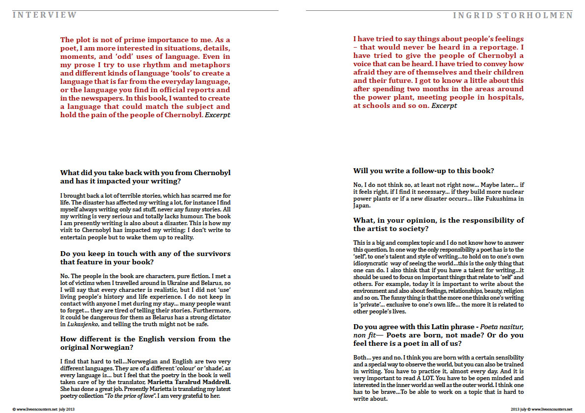 Ingrid Storholmen was born in Verdal, Norway, on 22 May 1976. She studied literature at the University of Bergen, and spent one year at a creative writing school. She was the literature editor of Morgenbladet, a culture newspaper in Norway. For five years, she was the writer-in-residence at ‘Adrianstua’, a writer’s house in Trondheim. She started the Trondheim International Literature Festival during her stay there, and also founded the literary magazine LUJ with two colleagues. She has published five books: The Law of the Poacher (2001, Shamespeesch); Graceland (2005); Siri’s Book (2007); Voices from Chernobyl (2009); To Praise Love (2011) published by Aschehoug in Oslo, Norway.
