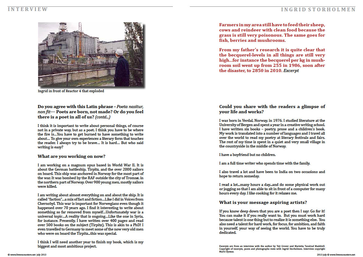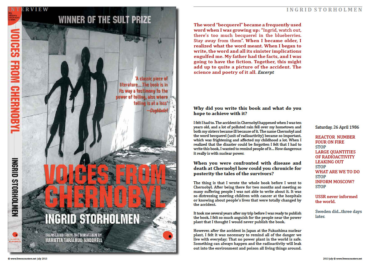 She has received many literary awards and prizes for her work, and her poetry has been translated into eighteen languages. Voices from Chernobyl bagged the Sult Prize 2010, and was shortlisted for the 2009 Critics’ Prize, the 2009 Brage Award and the 2009 Youth Critics’ Prize.