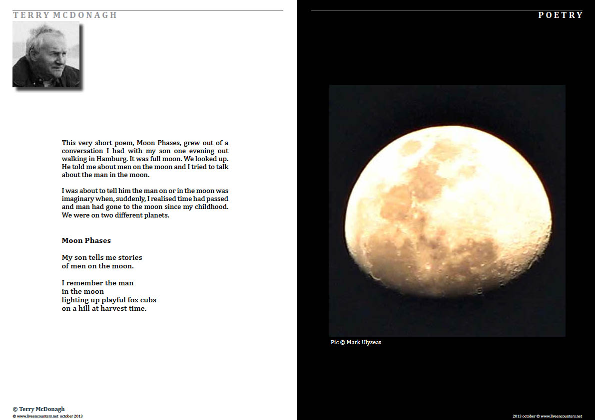 Irish poet and dramatist, Terry McDonagh, www.terry-mcdonagh.com, taught creative writing at the University of Hamburg and was Drama Director at the Int. School Hamburg for 15 years, He now works freelance. He has been writer in residence in Europe, Asia and Australia. He’s published seven poetry collections, a book of letters, as well as prose and poetry for young people Translated into Indonesian and German and distributed internationally by Syracuse Uni. Press. His latest poetry collection: Ripple Effect is due for publication in May/June 2013 – Arlen House, and his next children’s story, Michel the Merman, illustrated by Marc Barnes (NZ), is to be published in September 2013. He lives in Hamburg and Ireland.