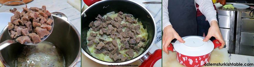 One of the dishes we made at our Aegean style Turkish cooking class at Hanimeli, near Sirince was this very delicious & impressive Etli Pilav – Rice cooked with chunks of meat and onions. It is common to incorporate meat and vegetables into the rice and flavors change in different regions, with the use of different spices. It has been very interesting to see how Etli Pilav is made in the Aegean region.