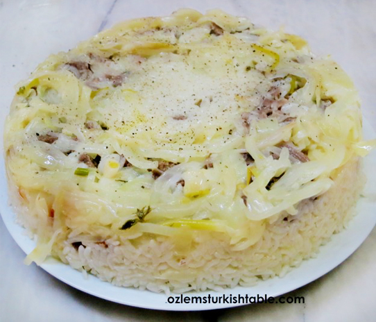 Before serving, turn the rice upside down on a wide serving tray, onions and the meat will appear as layers at the top, looking like a delicious savory cake. The delicious flavors of the cooked meat and onion blend in with the rice and make it very flavorsome.