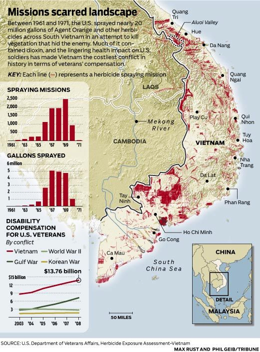 About a quarter of Southern Vietnam area was sprayed with Agent Orange. The heavy sprayed areas were provinces Quang Tri, Thua Thien-Hue, Quang Nam, Da Nang, Quang Ngai, Binh Dinh, Dong Nai, Binh Phuoc, Tay Ninh. Check the map