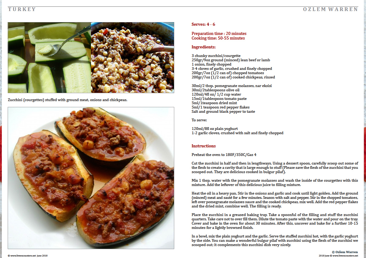 This is a wonderful dish from Antakya (Antioch), where my roots are from, and an exciting way to cook zucchini. Traditionally, the locals in Antakya would stuff the zucchini as a whole and they would lightly brown them before cooking with the sauce. I prefer cutting the zucchini in half and lengthways and baking them; healthy, delicious and pretty to have on the plate. You can prepare this dish ahead of time and the leftovers freeze beautifully. Please save the flesh of the zucchini that you scooped out. They are delicious cooked in bulgur pilaf with zucchini. How wonderful to share the food with friends and family. Living abroad and changing locations often, cooking and sharing food have been my salvation and a wonderful way of meeting new folks, making new friends. I hope you enjoy the recipes with friends and family and give yourself and everyone the gift of good food.