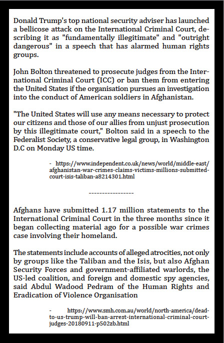 In other situations the ICC’s pursuit of a case may seem like outside interference, even meddling in one’s internal affairs by busy bodies or the illegitimate use of power. It can even be construed as a threat or an affront to national pride. A haughty nation with a proud history that believes itself to be perfect in all things, that adopts an ideology where its own institutions and methods of governance are mature and perfected to the extent that they should be emulated worldwide, is not likely at all to take kindly to being judged by an external power or to be told what to do. It cannot even conceive that it can do any wrong and will not entertain even the possibility that its citizens can be probed, tried and convicted by any international system of law. This endeavour will be deemed totally illegitimate, which explains John Bolton’s attitude to the ICC. Bolton cited US “exceptionalism”, an argument which is by no means an exceptional one because nearly all American politicians will be heard making such claims. Absurd as it is seems, they do appear to sincerely believe what they say in this respect, or at least they are sufficiently powerful to be able to compel others to accept it as a fait accompli.