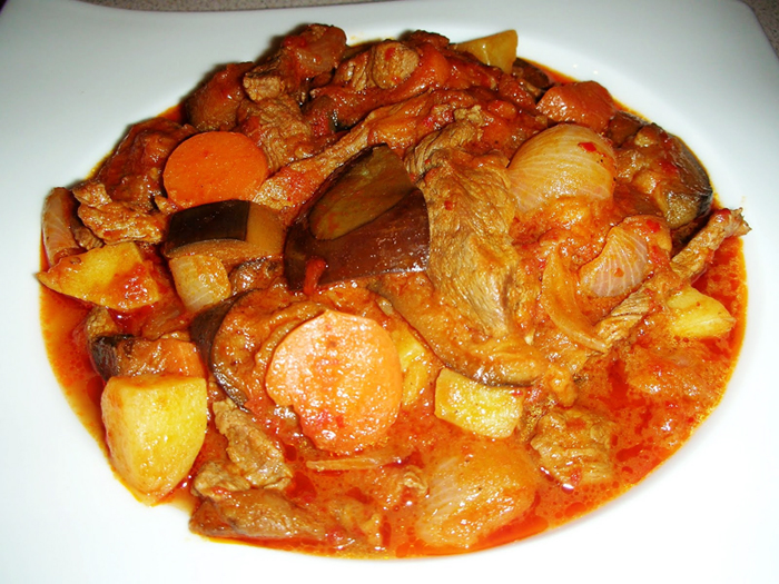 Heat the olive oil in a large, heavy pan. Stir in the eggplants and shallots and sauté until they start to turn golden brow (my mother actually would shake the pan too, so that the aubergines don’t get bruised:) Season with salt and pepper. Add the meat to brown a little. Toss in the carrots and potatoes and cook for a few minutes, stir well. Season with salt and black pepper generously. Add the chopped tomatoes, red pepper paste (if used) and water, mix well. Check the seasoning and add the red pepper flakes. Cover and cook on a medium to low heat for about 40 minutes, until the sauce starts to thicken.