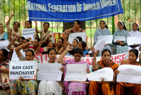 Activists in India protest against virginity tests in the states of Madhya Pradesh and Kerala in 2009. Raveendran/AFP/Getty Images https://www.npr.org/sections/goatsandsoda/2018/10/19/658155056/u-n-calls-for-end-to-virginity-tests