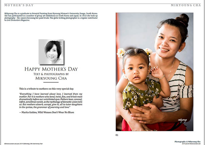 Mikyoung Cha is a graduate in Oriental Painting from Hyosung Women’s University, Daegu, South Korea. She has participated in a number of group art exhibitions in South Korea and Japan. In 2016 she took up photography – the camera becoming her paint brush. This globe trotting photographer is a regular contributor to Live Encounters Magazine.