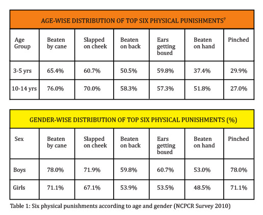 [7] A study carried out by Child Line India Foundation between 2009 and 2011 revealed that students experienced corporal punishment in almost 95% of the 198 schools in 11 states studied, despite it being prohibited. Only 6% of the government schools studied and 4% of the private schools studied were free of corporal punishment. Shukla Jyoti – Singh Neetu, “Implications of corporal punishment on primary school children” in IOSR, Journal of Humanities and Social Science, 15/6 (2013) pp. 57.