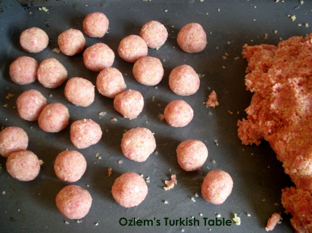 To make the bulgur meatballs, combine the chopped onion, bulgur, salt, black pepper, red pepper flakes and 1 cup of water and put through the food processor twice. Add the ground meat to the mixture and put through the food processor again (it is also possible to knead the mixture by hand, but that requires extra time and effort). Add the egg to the mixture and knead by hand until it is as smooth as bread dough. Prepare the bulgur balls by dipping your hand in water, taking a tiny lump of dough the size of a chickpea and rolling into a ball.