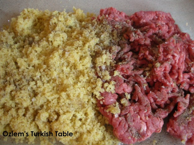 Bulgur meatballs mixture; if you can’t get the fine bulgur, you may blitz the coarse bulgur a couple of times to get the finer version.