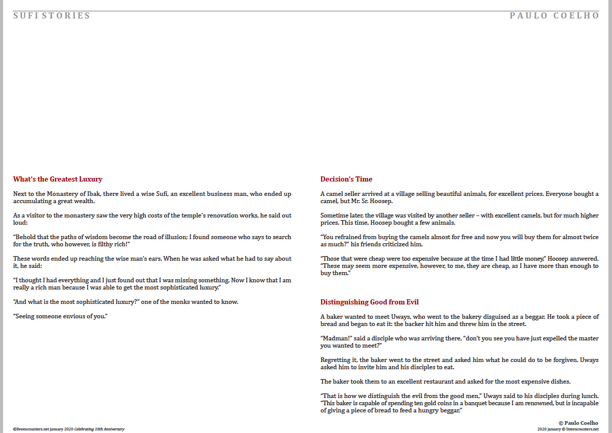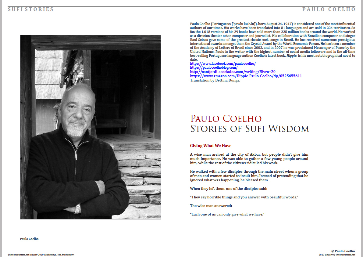 Paulo Coelho (Portuguese: [ˈpawlu kuˈeʎu]), born August 24, 1947) is considered one of the most influential authors of our times. His works have been translated into 81 languages and are sold in 224 territories. So far, the 1,018 versions of his 29 books have sold more than 225 million books around the world. He was born in Rio de Janeiro in 1947 and discovered early his vocation for writing. He worked as a director, theater actor, composer and journalist. His collaboration with Brazilian composer and singer Raul Seixas gave some of the greatest classic rock songs in Brazil. He has received numerous prestigious international awards amongst them the Crystal Award by the World Economic Forum. He has been a member of the Academy of Letters of Brazil since 2002, and in 2007 he was proclaimed Messenger of Peace by the United Nations. Paulo is the writer with the highest number of social media followers and is the all-time bestselling Portuguese language author. Coelho’s latest book, Hippie, is his most autobiographical novel to date. He takes us back in time to re-live the dream of a generation that longed for peace and dared to challenge the established social order – authoritarian politics, conservative modes of behavior, excessive consumerism, and an unbalanced concentration of wealth and power.