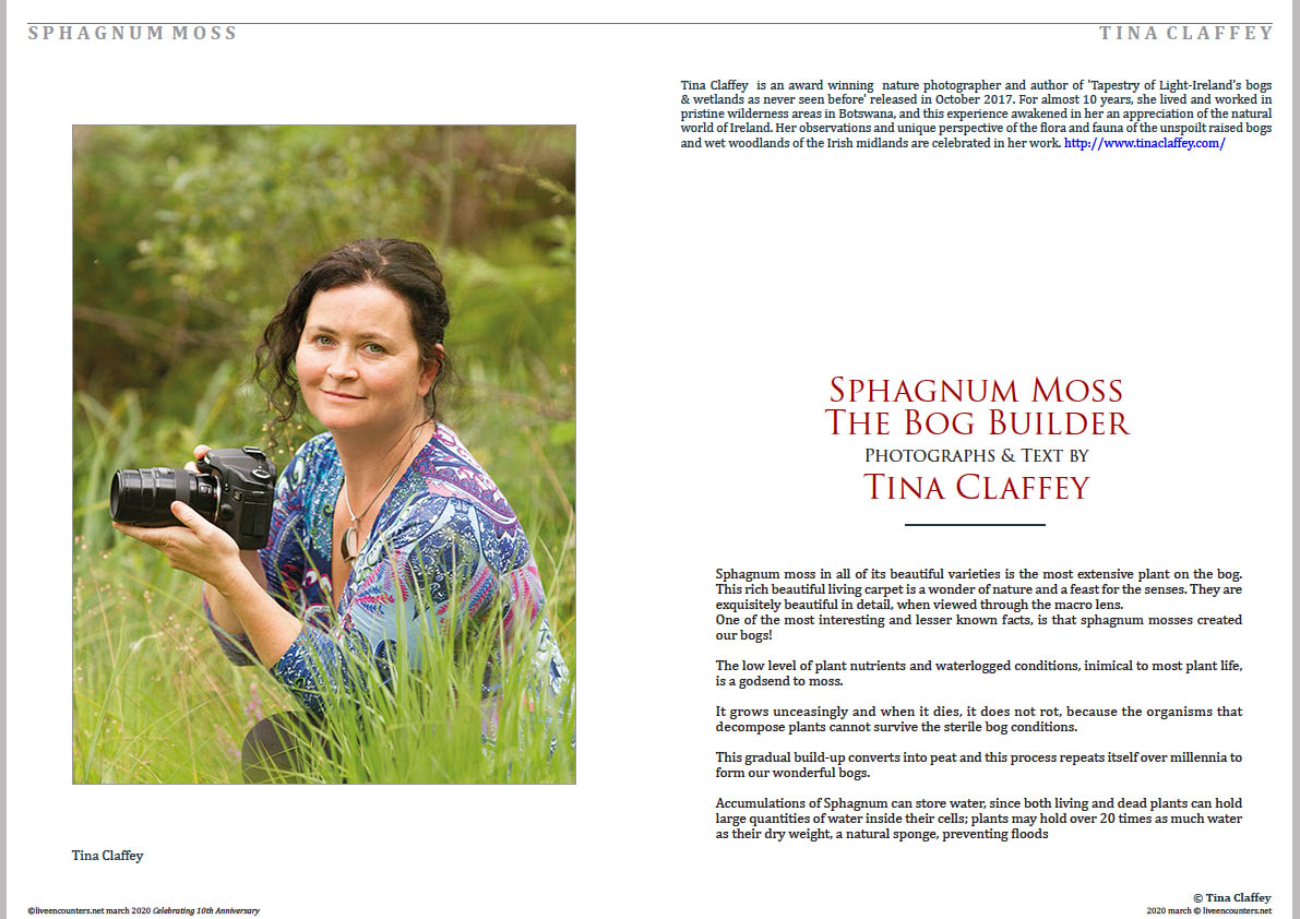 Tina Claffey is an award winning nature photographer and author of ‘Tapestry of Light-Ireland’s bogs & wetlands as never seen before’ released in October 2017. For almost 10 years, she lived and worked in pristine wilderness areas in Botswana, and this experience awakened in her an appreciation of the natural world of Ireland. Her observations and unique perspective of the flora and fauna of the unspoilt raised bogs and wet woodlands of the Ireland’s midlands are celebrated in her work. http://www.tinaclaffey.com