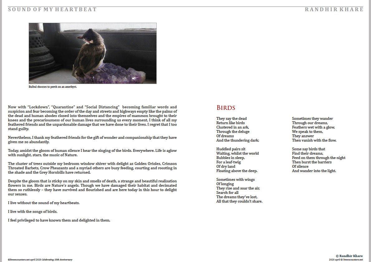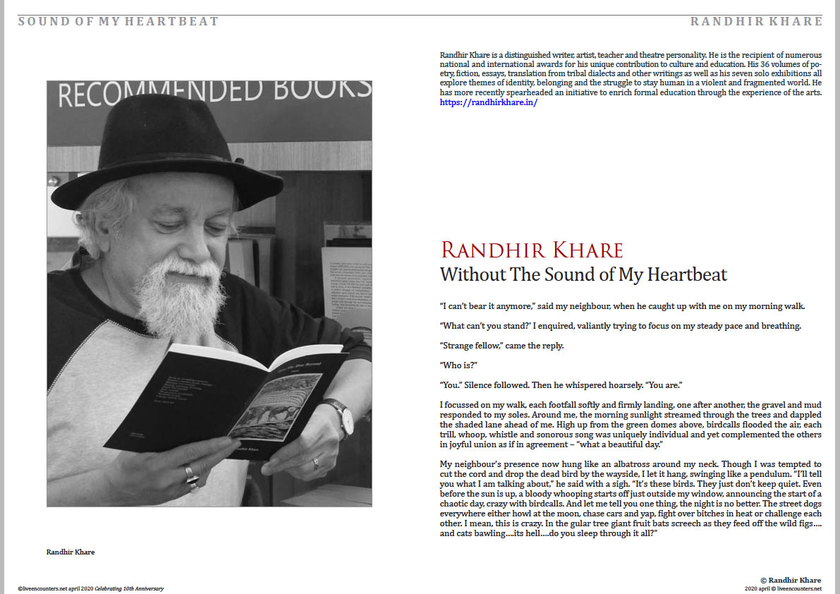Randhir Khare is an award winning poet, artist, writer, playwright, folklorist and distinguished educationist who has published thirty-six volumes of poetry, short fiction, essays, novels and educational handbooks and has travelled widely, reading and presenting his work, nationally and internationally. He has presented his work at the Nehru Centre in London, at the Ubud Writers Festival in Bali, the India Festival In Bulgaria, at the Writers Union in the Czech Republic, in Bulgaria, Slovenia, the Pune International Literary Festival and at the Europalia Arts Festival in Belgium. In India, he has performed his poetry with various traditional and contemporary musicians and founded (as well as leads) two poetry-music bands : MYSTIC and AFTER RUMI. Over the last year he has published two path-breaking volumes of poetry and drawings, MOUNTAINS OF MY SILENCE and MEMORY LAND, He is the recipient of The Sanskriti Award for Creative Writing, The Gold Medal for Poetry awarded by the Union of Bulgarian Writers, The Human Rights Award, The Residency Grant 2009 for his lifetime contribution to literature in English awarded by The Sahitya Akademi (The National Akademy Of Letters) and The Palash Award (for his lifetime contribution to education and culture) among others. He has completed four and a half decades of distinguished services to education and special education and founded The RBA Centre For Special Education & The CSE Centre For Children With Special Needs.