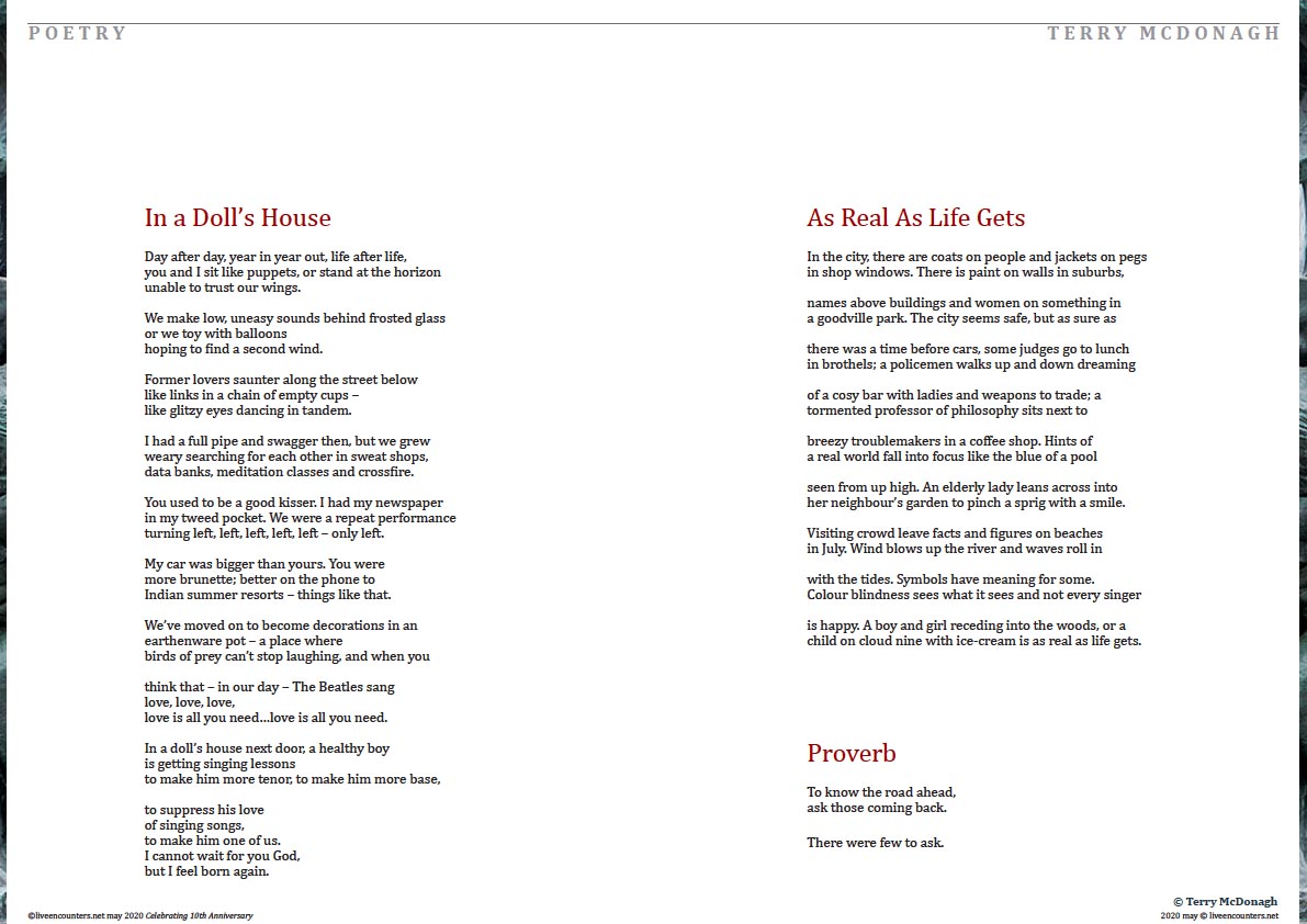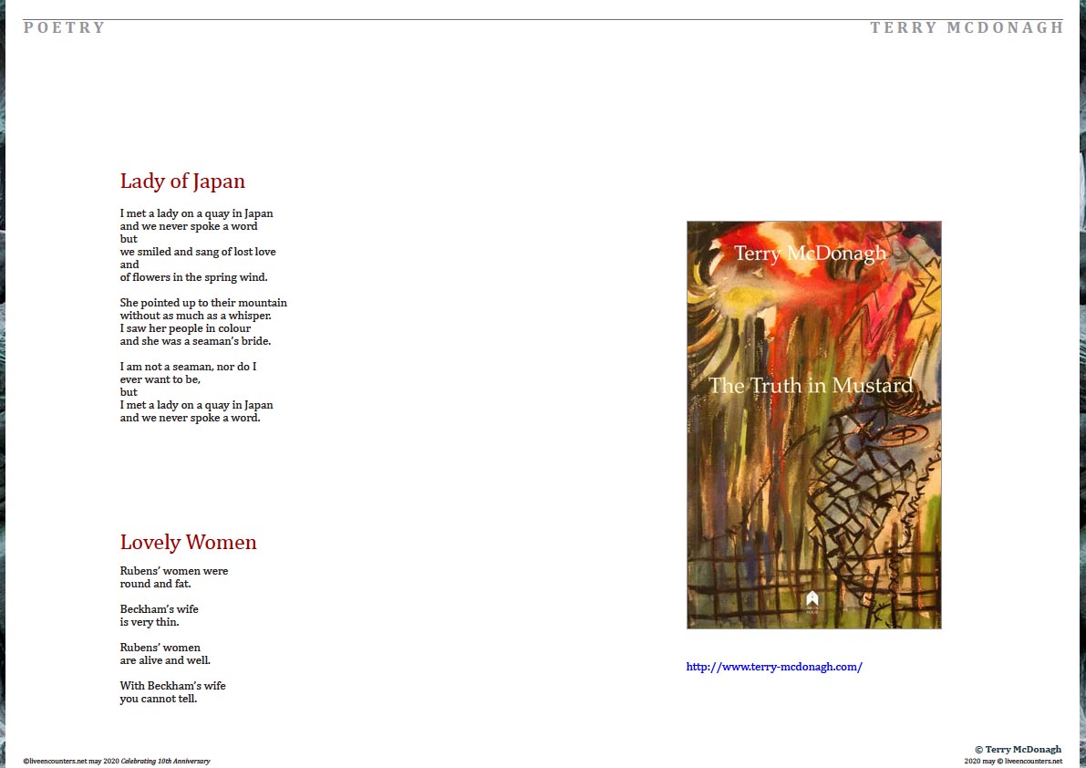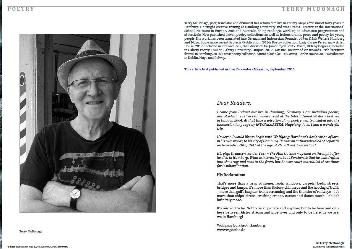 Terry McDonagh, poet and dramatist, taught creative writing at Hamburg University and was Drama Director at the International School Hamburg. He’s published ten poetry collections as well as letters, drama, prose and poetry for young people. His work has been translated into German and Indonesian. 2016: poetry collection, Lady Cassie Peregrina – Arlen House. 2017: included in Fire and Ice 2, Gill Education for Junior Cycle. 2017: poem, UCG by Degrees, included in Galway Poetry Trail on Galway University Campus. 2017: Director of WestWords, Irish literature festival in Hamburg. 2018: latest poetry collection, Fourth Floor Flat – 44 Cantos, published autumn 2018 by Arlen House. http://www.terry-mcdonagh.com/