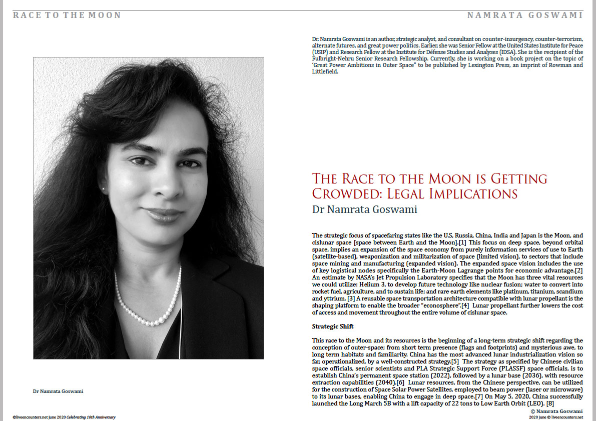 Dr. Namrata Goswami is an author, strategic analyst and consultant on counter-insurgency, counter-terrorism, alternate futures, and great power politics. After earning her Ph.D. in international relations, she served for nearly a decade at India’s Ministry of Defense (MOD) sponsored think tank, the Institute for Defence Studies and Analyses (IDSA), New Delhi, working on ethnic conflicts in India’s Northeast and China-India border conflict. She is the author of three books, “India’s National Security and Counter-Insurgency”, “Asia 2030” and “Asia 2030 The Unfolding Future.” Her research and expertise generated opportunities for collaborations abroad, and she accepted visiting fellowships at the Peace Research Institute, Oslo, Norway; the La Trobe University, Melbourne, Australia; and the University of Heidelberg, Germany. In 2012, she was selected to serve as a Jennings-Randolph Senior Fellow at the United States Institute of Peace (USIP), Washington D.C. where she studied India-China border issues, and was awarded a Fulbright-Nehru Senior Fellowship that same year. Shortly after establishing her own strategy and policy consultancy, she won the prestigious MINERVA grant awarded by the Office of the U.S. Secretary of Defense (OSD) to study great power competition in the grey zone of outer space. She was also awarded a contract with Joint Special Operations University (JSOU), to work on a project on “ISIS in South and Southeast Asia”. With expertise in international relations, ethnic conflicts, counter insurgency, wargaming, scenario building, and conflict resolution, she has been asked to consult for audiences as diverse as Wikistrat, USPACOM, USSOCOM, the Indian Military and the Indian Government, academia and policy think tanks. She was the first representative from South Asia chosen to participate in the George C. Marshall European Center for Security Studies NATO Partnership for Peace Consortium (PfPC) ‘Emerging Security Challenges Working Group.’ She also received the Executive Leadership Certificate sponsored by the Harvard Kennedy School of Government, National Defense University (NDU), and the Asia Pacific Center for Security Studies (APCSS). Currently, she is working on a book project on the topic of ‘Great Power Ambitions in Outer Space” to be published by Lexington Press, an imprint of Rowman and Littlefield.