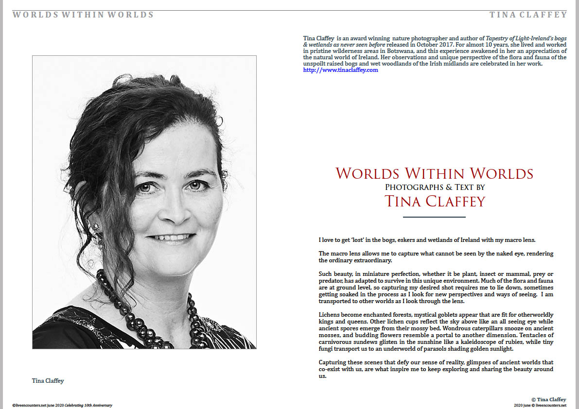 Tina Claffey is an award winning nature photographer and author of ‘Tapestry of Light-Ireland’s bogs & wetlands as never seen before’ released in October 2017. For almost 10 years, she lived and worked in pristine wilderness areas in Botswana, and this experience awakened in her an appreciation of the natural world of Ireland. Her observations and unique perspective of the flora and fauna of the unspoilt raised bogs and wet woodlands of the Irish midlands are celebrated in her work. http://www.tinaclaffey.com