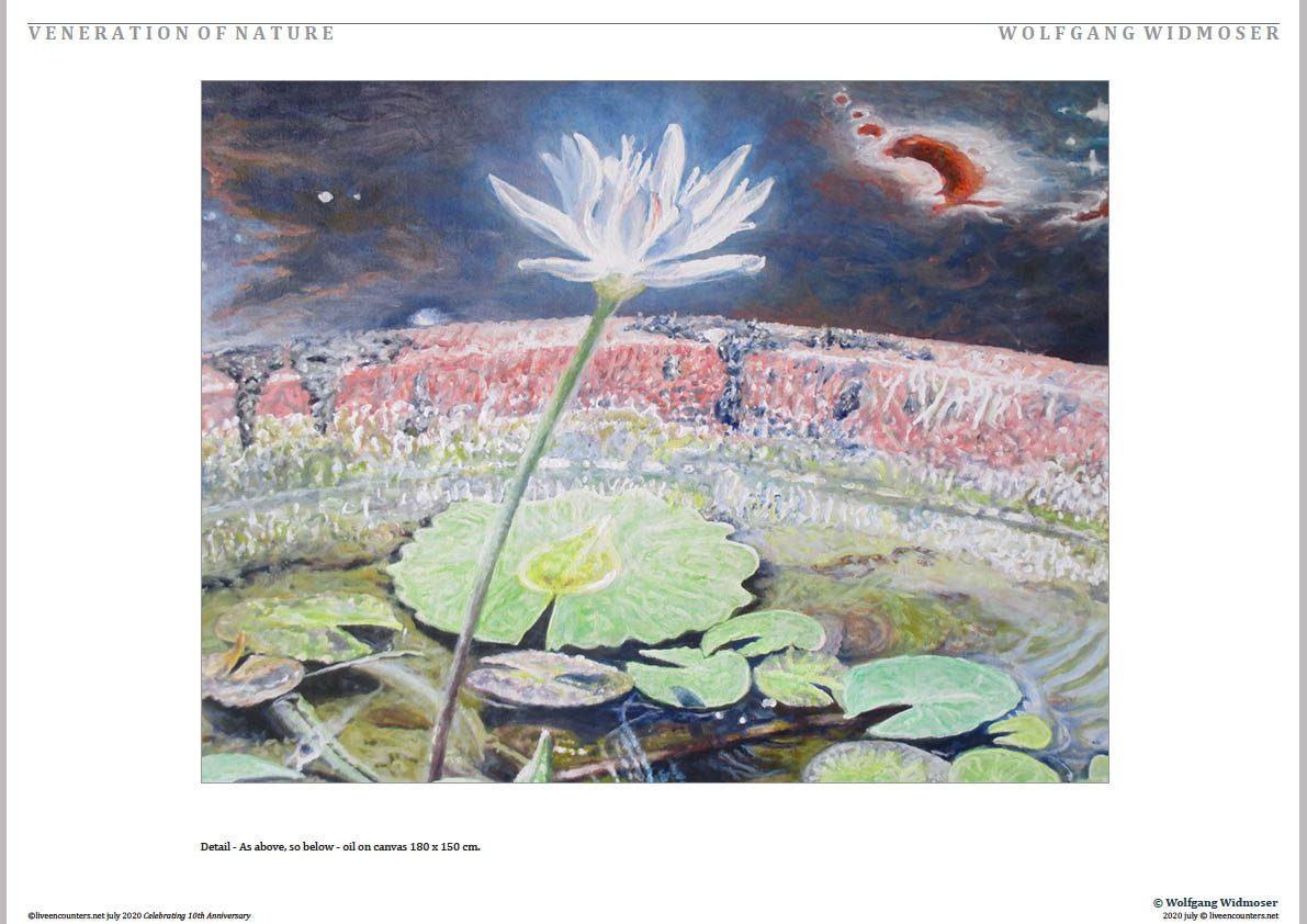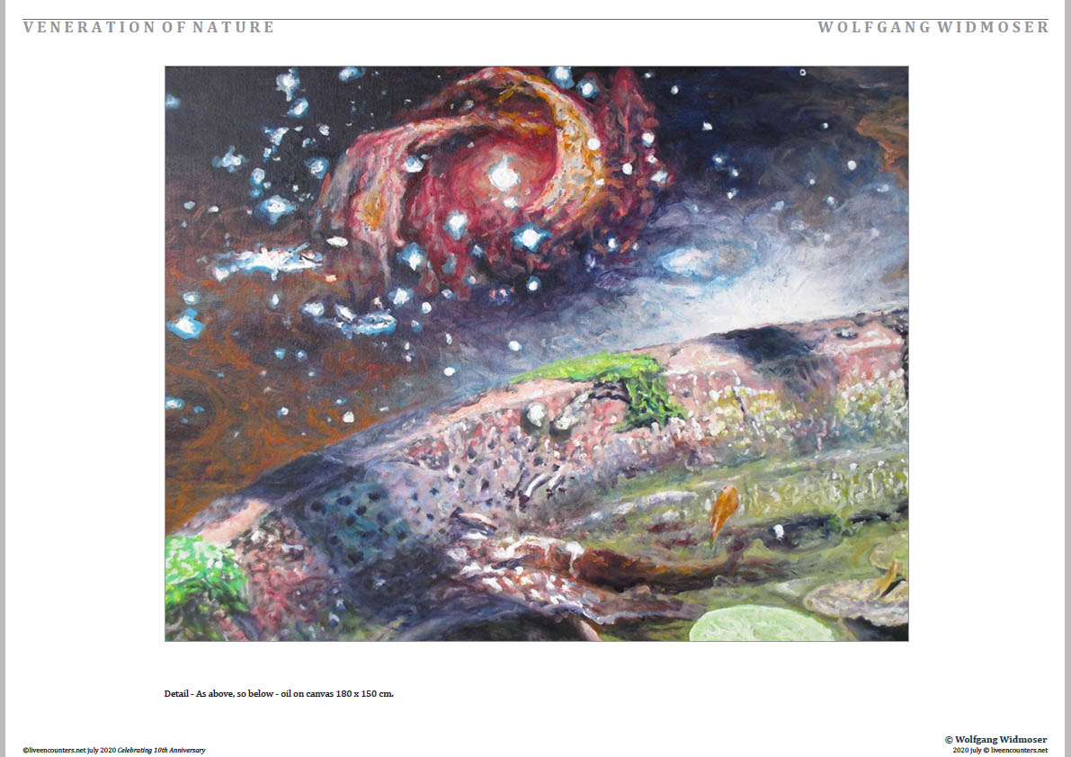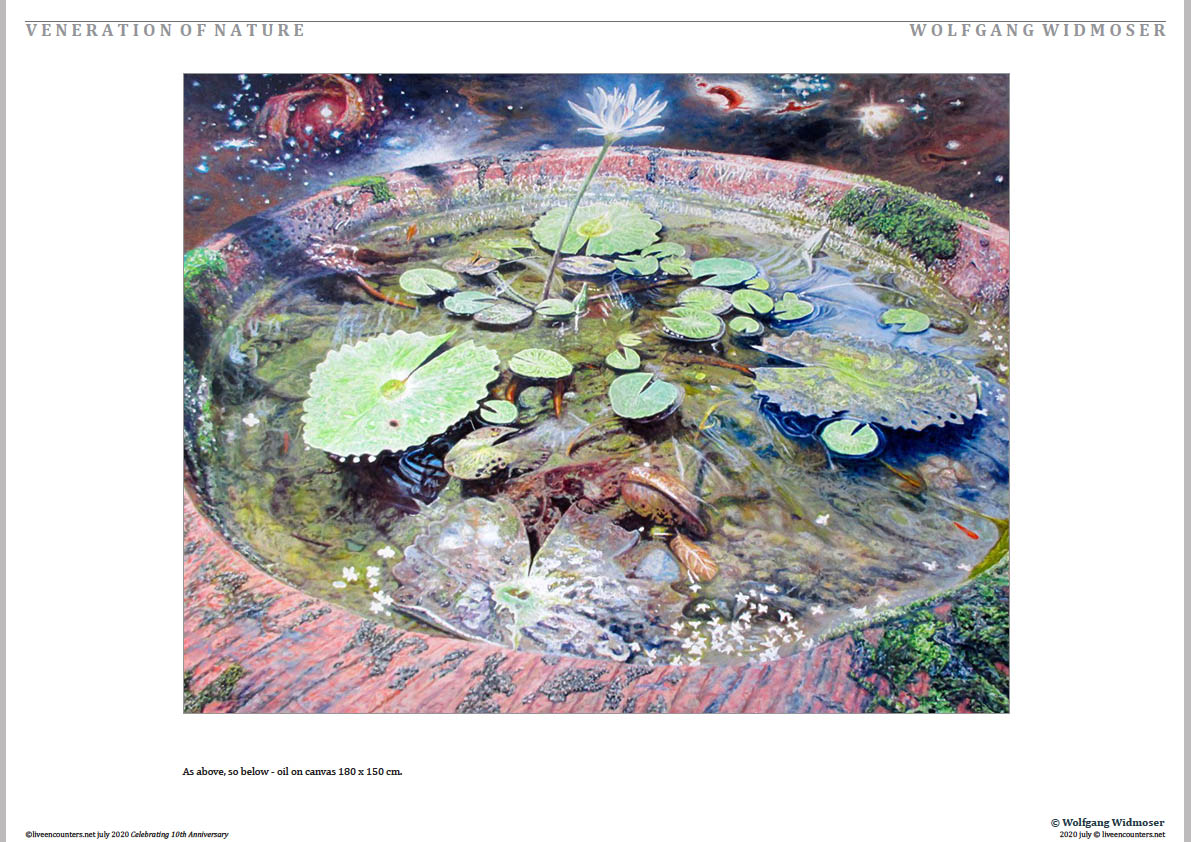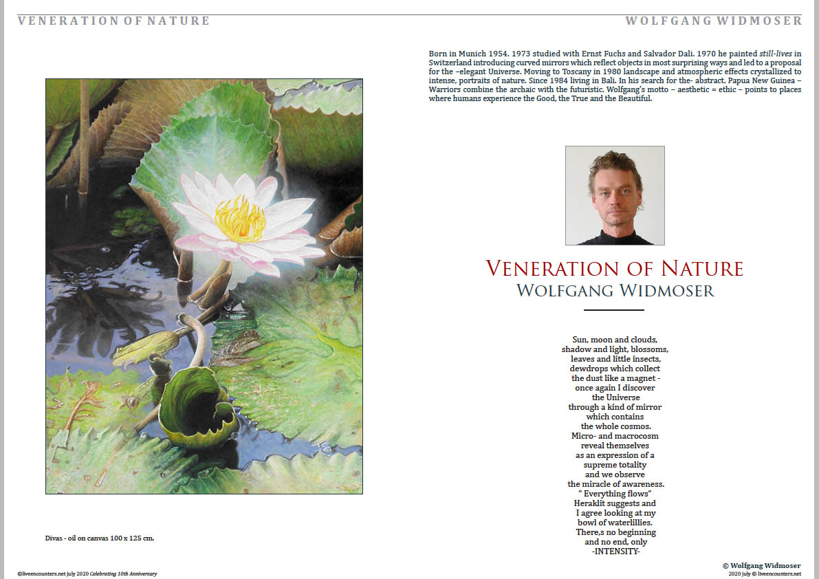 Wolfgang Widmoser was born in Munich on February 25th 1954. Frequent excursions in the Alps taught him the wondrous and sometimes perilous conditions of life. Fascinated by what he experienced he turned to Art as a form of exploration. Since early childhood Wolfgang engaged in many artistic endeavors, Painting  Music Architecture and Philosophy to understand the meaning of the world. After finishing high-school he went to study with Ernst Fuchs and Salvador Dali to become familiar with old-master-techniques of painting and the intricacies of rendering dreams. The many discussions he had with both  masters opened his eyes and confirmed Wolfgang’s capacity to render his vision with utmost clarity. With his Still lifes from the seventies a world of objects and their relationships formed to complex compositions. Studies about projective geometry led Wolfgang  to introduce curved mirrors that reflect the objects in surprising ways and led to the proposal of an elegant Universe. Moving to Toscany in 1980 landscape and atmospheric  effects crystallized to intense Portraits of Nature – a theme he is still persecuting today. Since 1984 Wolfgang kept visiting Bali where he is living today. In his search for the- abstract- he  discovered photos of Papua New Guinea – Warriors with their fascinating body-paints. A series of large formatted canvases of archetypal  faces evolved. A Phanteon of personified elements to combine the archaic with the futuristic. In the 1990s the always latent passion for architecture broke to the surface. His father,  a gifted architect and painter himself  always supported his son in his aspirations. Inspired by tensile structures(Frei Otto) and lightweight engineering (Buckminster Fuller)  Wolfgang set out to design a sculptural and organic set of shapes  – a unification of landscape and city. Some of his ideas were realized in Indonesia and Europe. Wolfgang’s motto – aesthetic = ethic – points to a new version of the – Gesamtkunstwerk – places where humans experience the Good, the True and the Beautiful.