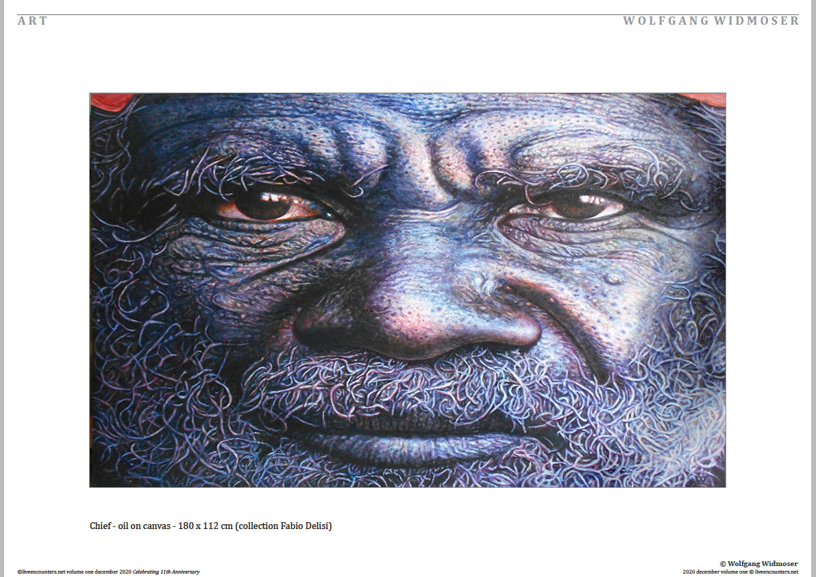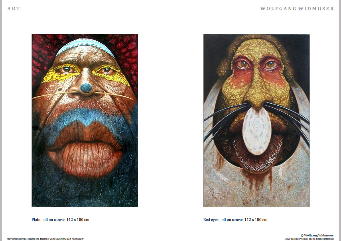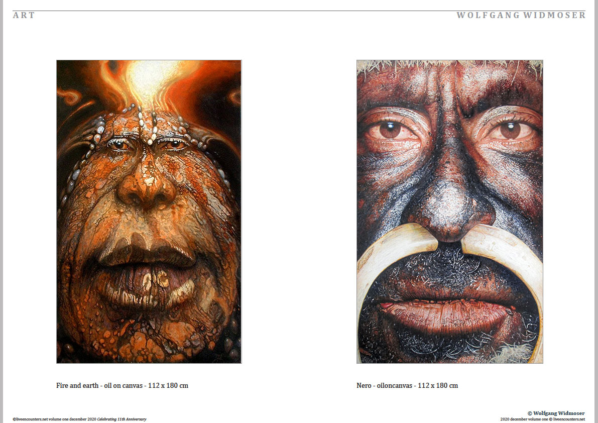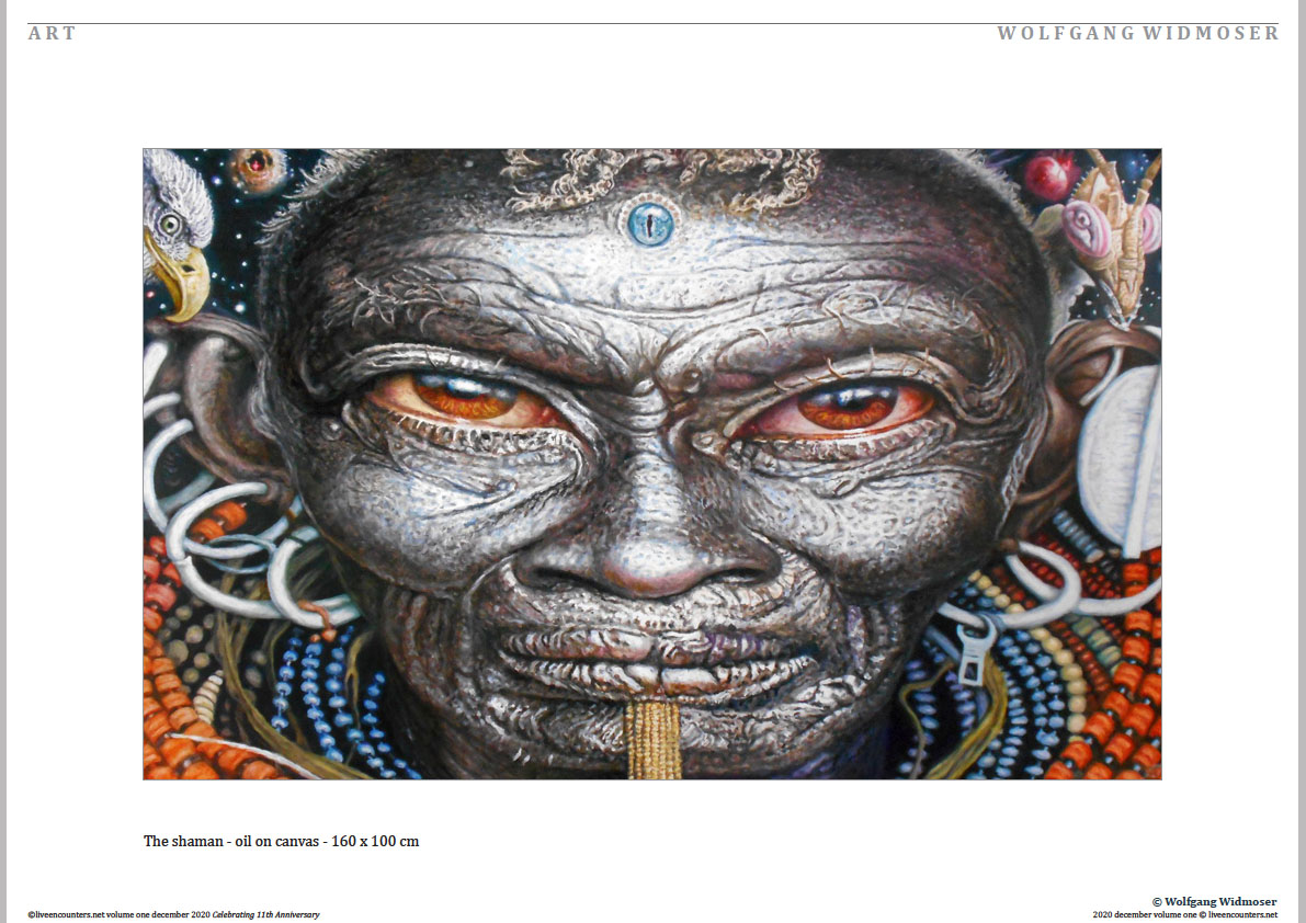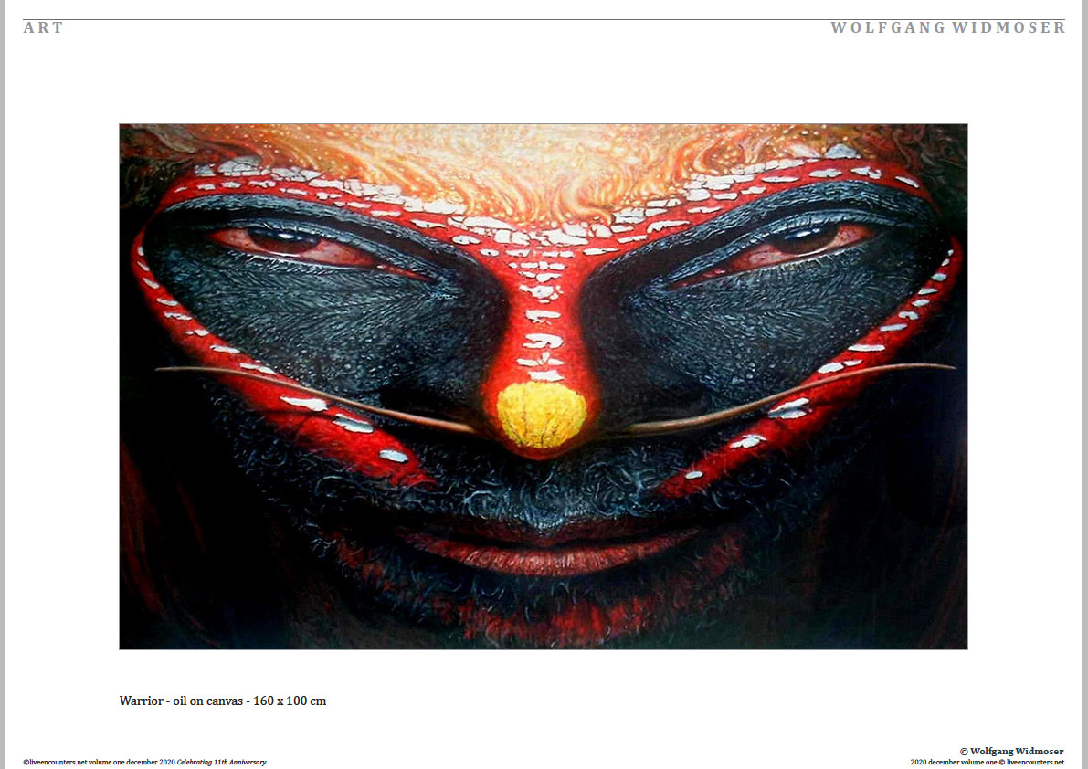 Born in Munich 1954. 1973 studied with Ernst Fuchs and Salvador Dali. 1970 he painted still-lives in Switzerland introducing curved mirrors which reflect objects in most surprising ways and led to a proposal for the –elegant Universe. Moving to Toscany in 1980 landscape and atmospheric effects crystallized to intense, portraits of nature. Since 1984 living in Bali. In his search for the- abstract. Papua New Guinea – Warriors combine the archaic with the futuristic. Wolfgang’s motto – aesthetic = ethic – points to places where humans experience the Good, the True and the Beautiful.