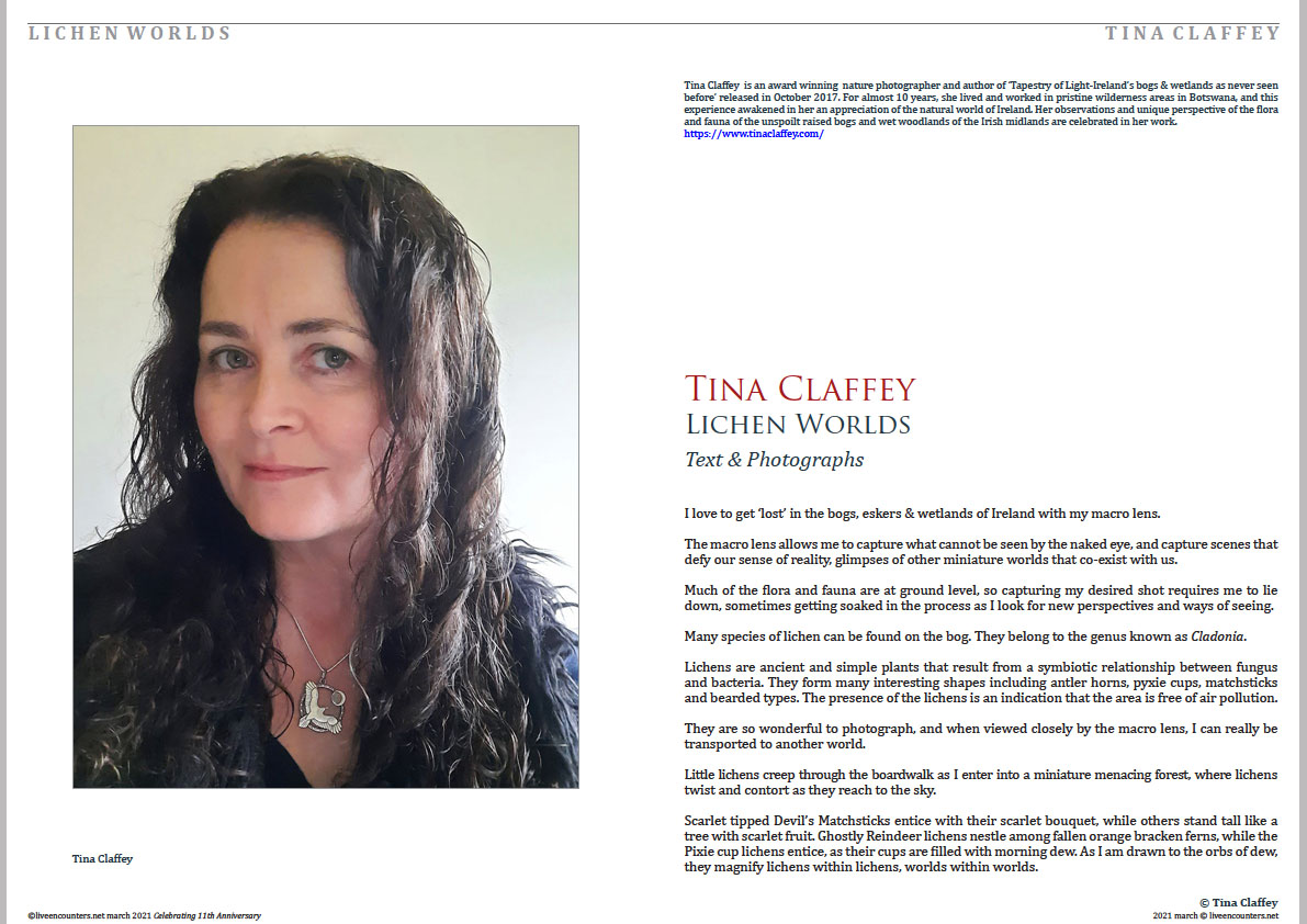 Tina Claffey is an award winning nature photographer and author of ‘Tapestry of Light-Ireland’s bogs & wetlands as never seen before’ released in October 2017. For almost 10 years, she lived and worked in pristine wilderness areas in Botswana, and this experience awakened in her an appreciation of the natural world of Ireland. Her observations and unique perspective of the flora and fauna of the unspoilt raised bogs and wet woodlands of the Irish midlands are celebrated in her work. Website: https://www.tinaclaffey.com
