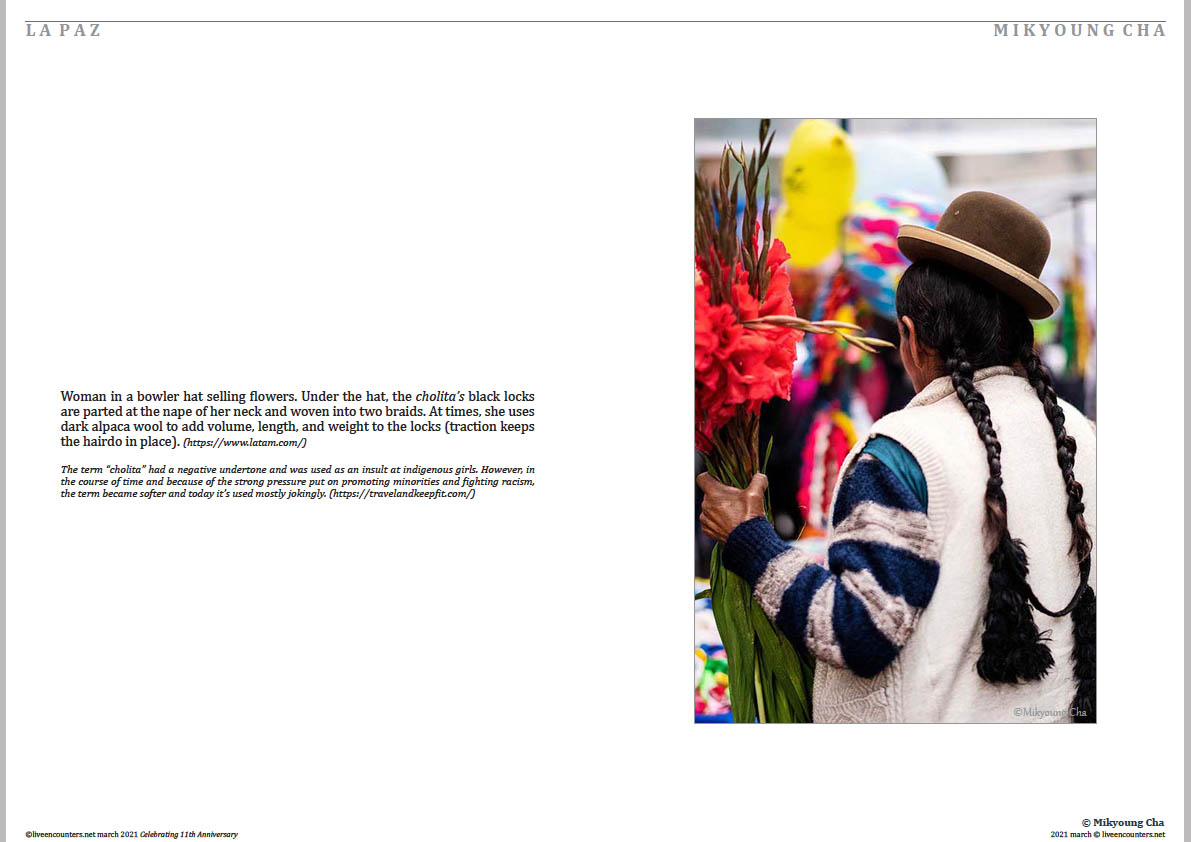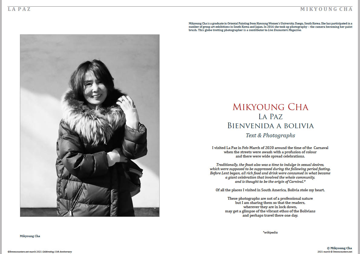 Live Encounters Magazine April 2021.Mikyoung Cha is a graduate in Oriental Painting from Hyosung Women’s University, Daegu, South Korea. She has participated in a number of group art exhibitions in South Korea and Japan. In 2016 she took up photography – the camera becoming her paint brush. This globe trotting photographer is a contributor to Live Encounters Magazine.