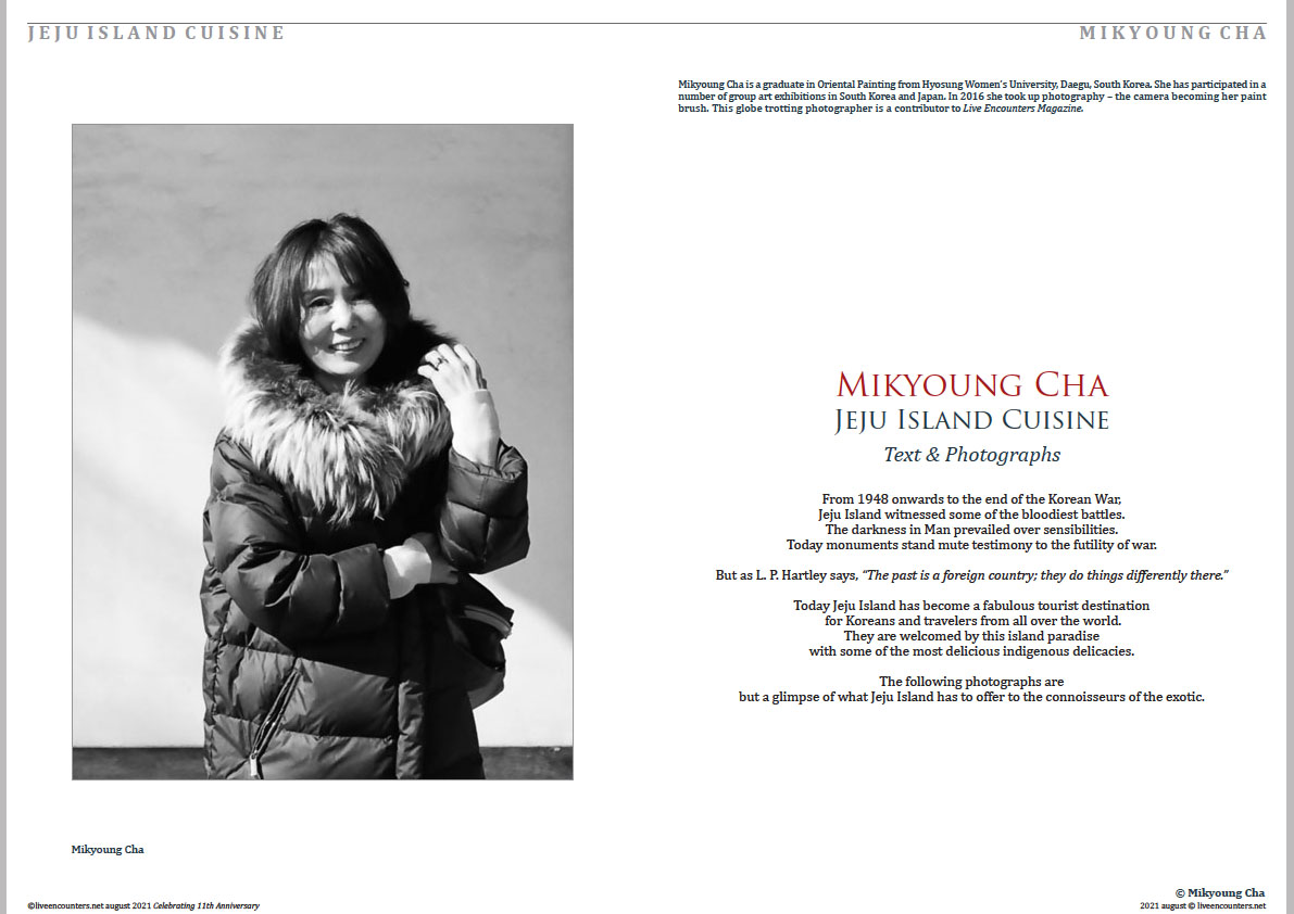Mikyoung Cha is a graduate in Oriental Painting from Hyosung Women’s University, Daegu, South Korea. She has participated in a number of group art exhibitions in South Korea and Japan. In 2016 she took up photography – the camera becoming her paint brush. This globe trotting photographer is a contributor to Live Encounters Magazine.