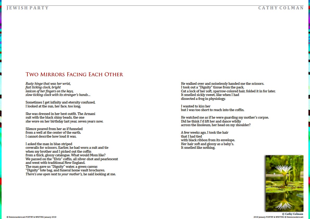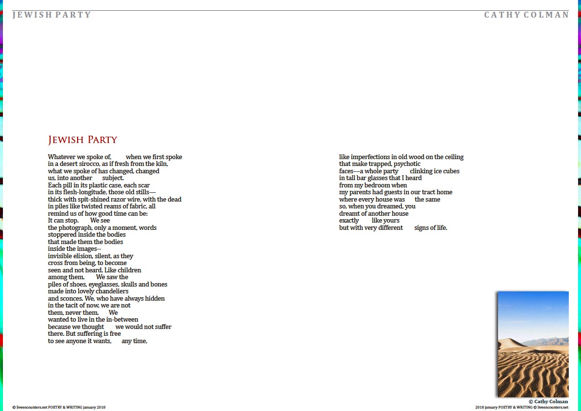 Cathy Colman’s first poetry collection, Borrowed Dress, won The Felix Pollak Award from the University of Wisconsin and was on The Los Angeles Times Bestseller list. Her second book Beauty’s Tattoo was published by Tebot Bach. Her poems have appeared in The Gettysburg Review, Ploughshares, Barrow Street, The Colorado Review, The Journal, The Huffington Post, Prairie Schooner and elsewhere.