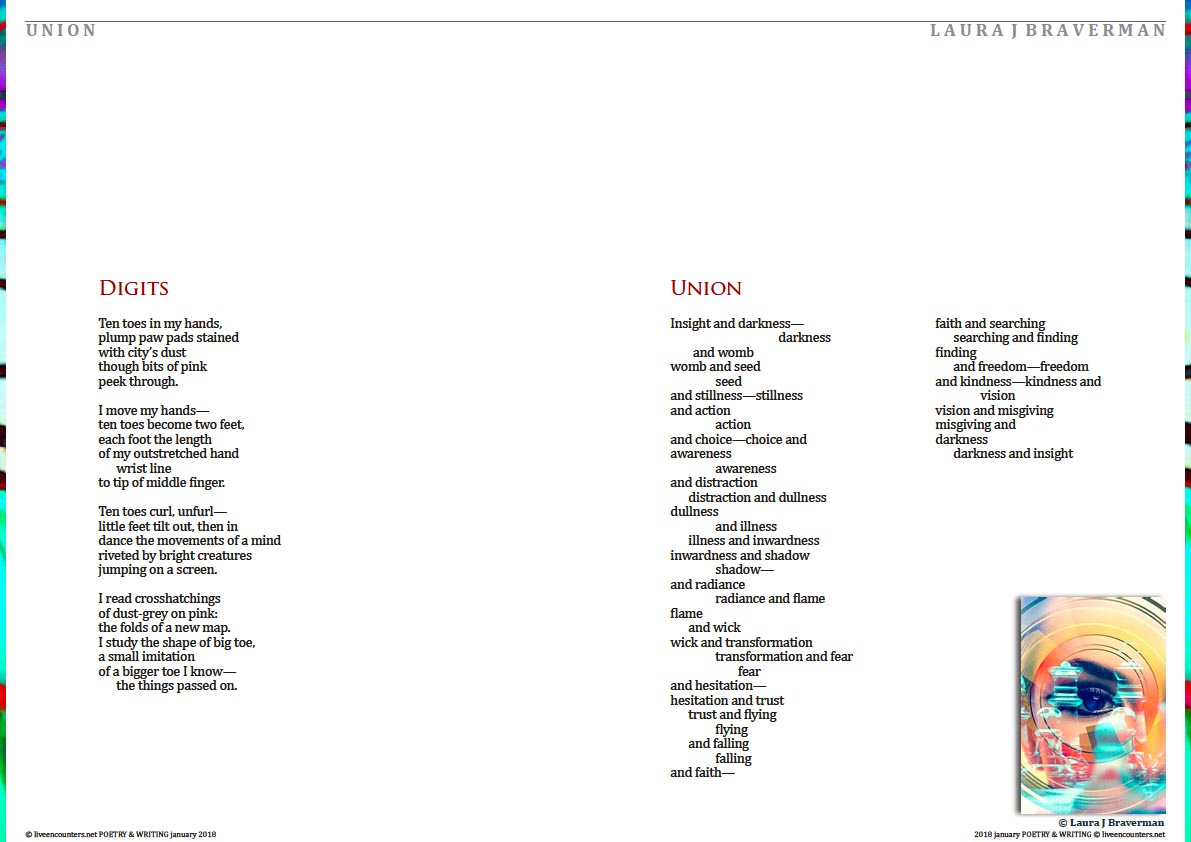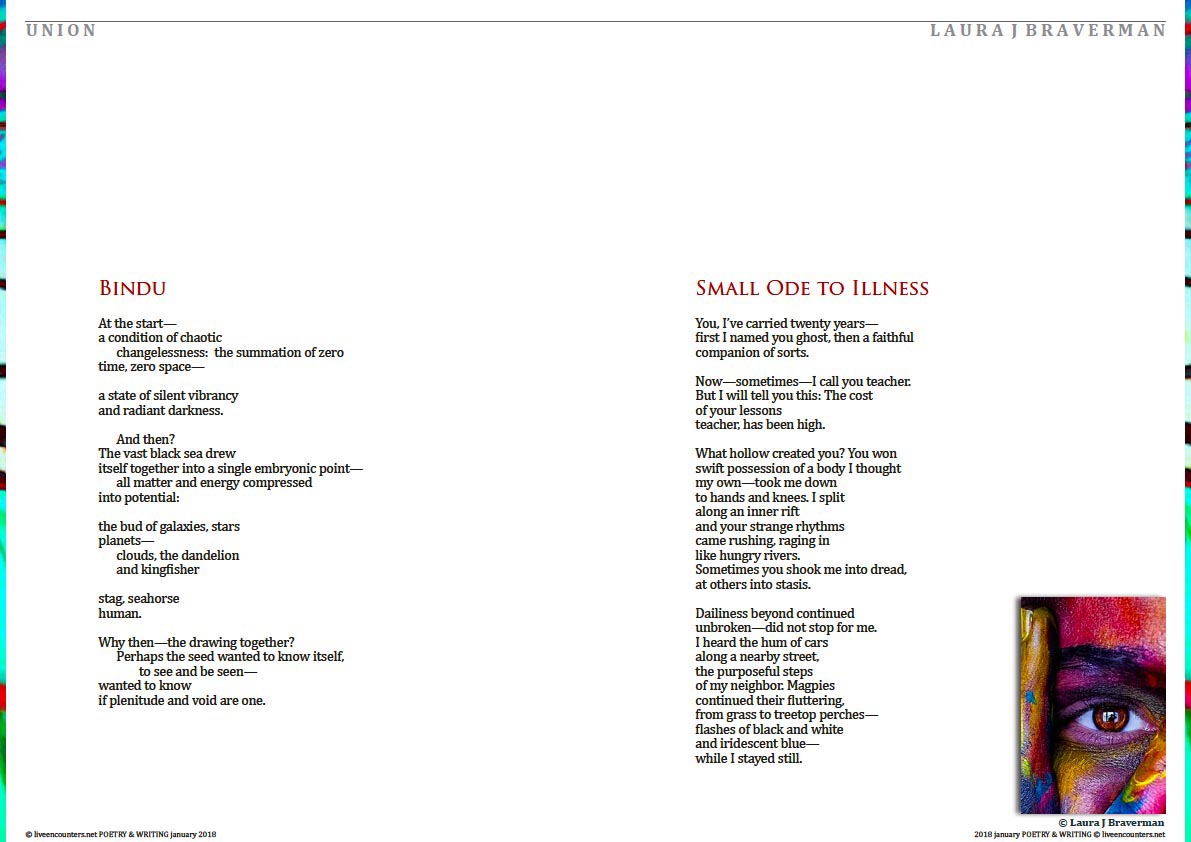 Laura J. Braverman studied fine art and apparel design at Rhode Island School of Design, and worked internationally in apparel for many years. In addition to painting, she now focuses on writing, having completed a writer’s certificate in creative nonfiction with Stanford University; taken numerous courses in poetry and essay at the New School Continuing Education Program; and, participated in workshops with poet James Arthur, and with nonfiction writer Sven Birkerts at Bennington College graduate writing seminars. Her work has appeared in the prose anthology Mountain Stories, and the poetry journals Live Encounters, The BeZINE, and Mediterranean Poetry, and will soon appear in California Quarterlyand Levure Litteraire.