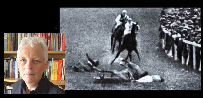 Above b/w photograph : Emily Wilding Davison (11 October 1872 – 8 June 1913) was a suffragette who fought for the right of women to vote in the United Kingdom in the early twentieth century. She died after being hit by King George V’s horse Anmer at the 1913 Epsom Derby when she walked onto the track during the race to what is now revealed to be an attempt to tie a flag of protest to the King’s horse. Above photograph is a screenshot of the actual event. She can be seen on the ground on the left.