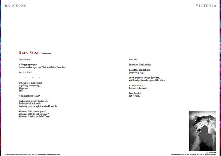 Victoria is a Year 12 student from Melbourne, Australia. She has enjoyed the reading and performance of prose, drama texts and poetry for most of her life, stemming from her early childhood. She also enjoys jazz and music, particularly the atmosphere that various soundscapes create. This poem is inspired by a moment of chaos, contemplation and confusion.