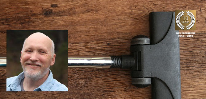 From the hindsight of a flea, this dark mastodon snuffs in one appendage the cracker crumbs of the over-stuffed couch. But it is mainly from the hover-craft of its flat head that small things begin to tremble, then ascend—the way, in some vacuous novel, alien lights might vaporize into the stratosphere of unimaginably tangled worlds. Hair ground into the soft, synthetic knit of the under life of the human foot, cartilage clipped from toe and finger tips, live arthropods and the dried husks of their dead, the flurry of molting skin, fluff devils, matted fur, wild seeds, mud the dog tracked in: all lift to the vortex of its spun, stiff brush and deep, industrial suck. Then, when a man or a woman’s touch has quieted it, the promise of a certain absence still gestates in our closets. It is, nonetheless, the action of skimming along carpets that holds its main interest: it spits back paperclips and thumb tacks. Otherwise it seems, on some diminutive level, omnivorous, its digestive track attached to the spine of its back. If we tug its umbilical cord all the way back to the point of origin (the double slit of the wall’s orifice), the spark that powers its ability to lift things absent from our lives flies to the bowels of the substrata’s black fossils, to the atom’s bulge. It holds its breath for weeks, then its ripe belly seems about to break: When we touch the button marked “easy open” or “release,” one last puff of dust exiles up.