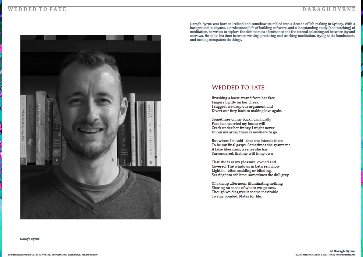 Daragh Byrne was born in Ireland and somehow stumbled into a decade of life-making in Sydney. With a background in physics, a professional life of building software, and a longstanding study (and teaching) of meditation, he writes to explore the dichotomies of existence and the eternal balancing act between joy and sorrows. His writing covers themes relating to the meaning of “home”, the varieties of metaphysics behind science and spiritual practice and the lingering effects of grief. He’s particularly interested in the effects of the loss of faith on a nation, as experienced in his home country in the last few generations. He has published in The Blue Nib and Backstory Journal. He is currently Convener of The Sydney Poetry Lounge, a longstanding open mic night that runs on the third Wednesday of every month.