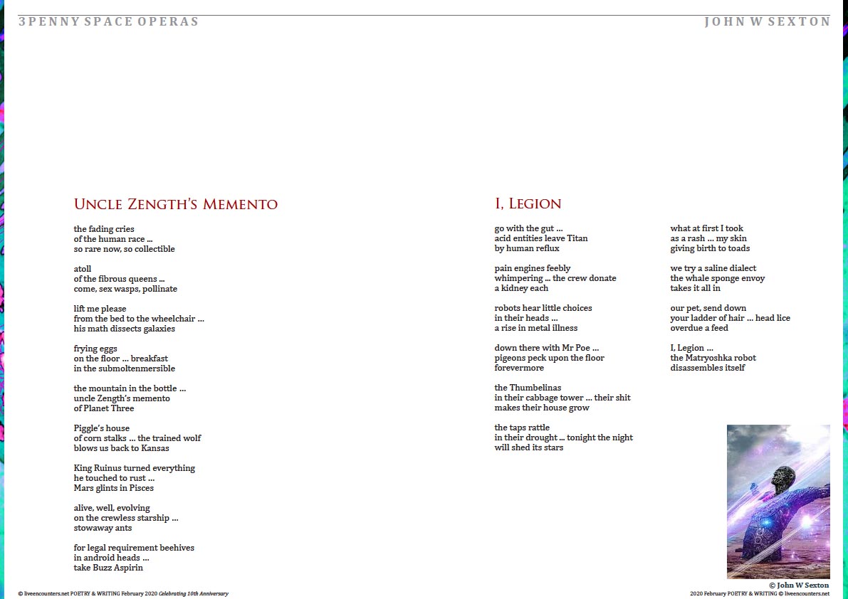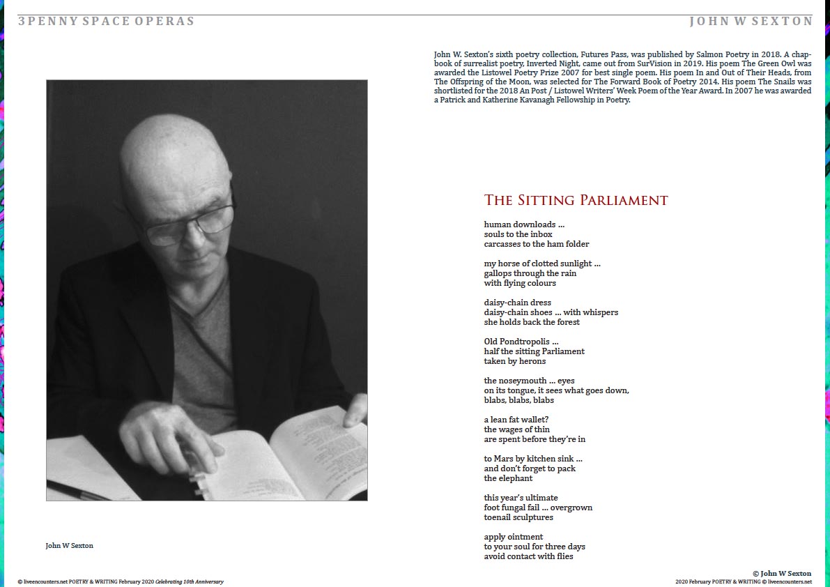 John W. Sexton’s sixth poetry collection, Futures Pass, was published by Salmon Poetry in 2018. A chapbook of surrealist poetry, Inverted Night, came out from SurVision in April 2019. His poem The Green Owl was awarded the Listowel Poetry Prize 2007 for best single poem. His poem In and Out of Their Heads, from The Offspring of the Moon, was selected for The Forward Book of Poetry 2014. His poem The Snails was shortlisted for the 2018 An Post / Listowel Writers’ Week Poem of the Year Award. In 2007 he was awarded a Patrick and Katherine Kavanagh Fellowship in Poetry.