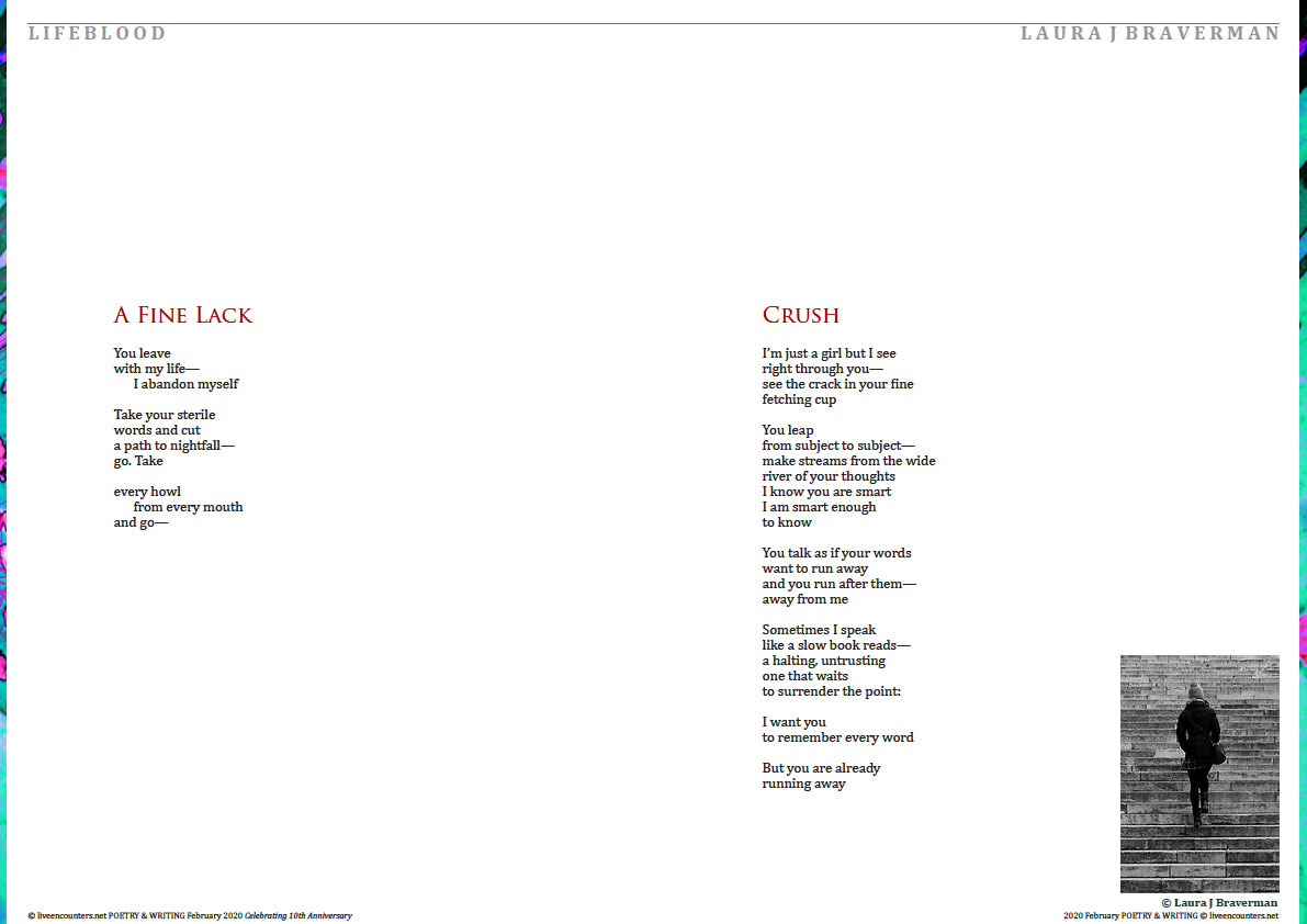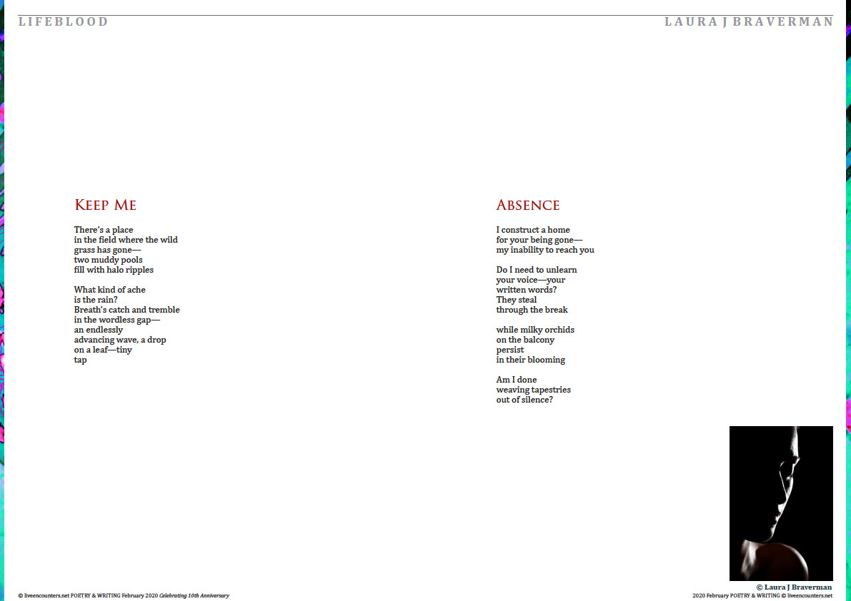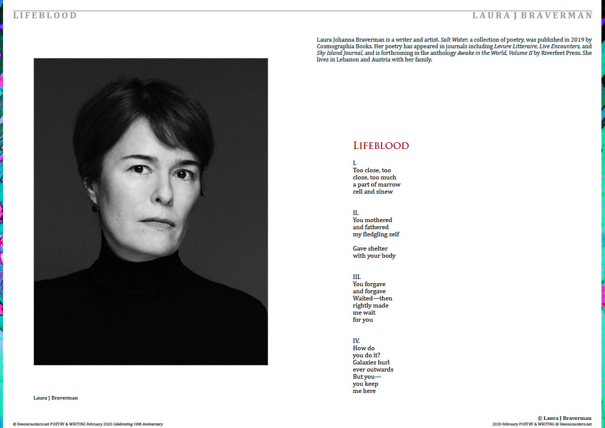 Laura Johanna Braverman is a writer and artist. Salt Water, a collection of poetry, was published in 2019 by Cosmographia Books. Her poetry has appeared in journals including Levure Litteraire, Live Encounters, and Sky Island Journal, and is forthcoming in the anthology Awake in the World, Volume II by Riverfeet Press. She lives in Lebanon and Austria with her family.
