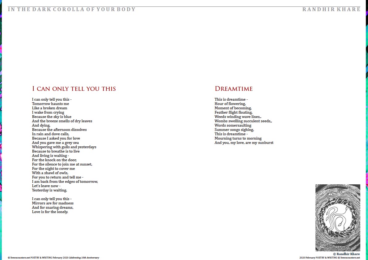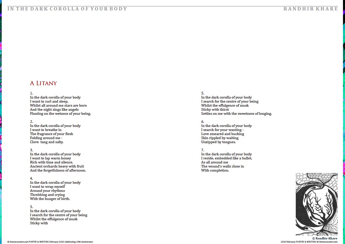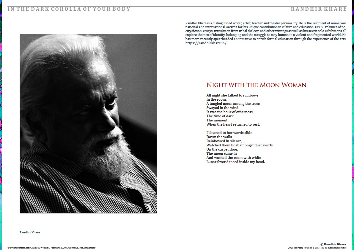 Randhir Khare is an award winning poet, artist, writer, playwright, folklorist and distinguished educationist who has published thirty-six volumes of poetry, short fiction, essays, novels and educational handbooks and has travelled widely, reading and presenting his work, nationally and internationally. He has presented his work at the Nehru Centre in London, at the Ubud Writers Festival in Bali, the India Festival In Bulgaria, at the Writers Union in the Czech Republic, in Bulgaria, Slovenia, the Pune International Literary Festival and at the Europalia Arts Festival in Belgium. In India, he has performed his poetry with various traditional and contemporary musicians and founded (as well as leads) two poetry-music bands : MYSTIC and AFTER RUMI. Over the last year he has published two path-breaking volumes of poetry and drawings, MOUNTAINS OF MY SILENCE and MEMORY LAND, He is the recipient of The Sanskriti Award for Creative Writing, The Gold Medal for Poetry awarded by the Union of Bulgarian Writers, The Human Rights Award, The Residency Grant 2009 for his lifetime contribution to literature in English awarded by The Sahitya Akademi (The National Akademy Of Letters) and The Palash Award (for his lifetime contribution to education and culture) among others. He has completed four and a half decades of distinguished services to education and special education and founded The RBA Centre For Special Education & The CSE Centre For Children With Special Needs.