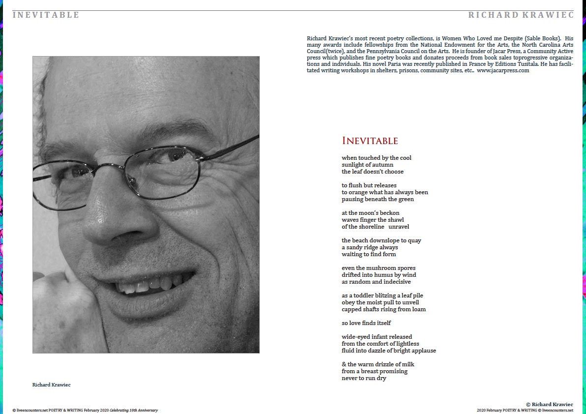 Richard Krawiec has published three poetry collections, most recently Women Who Loved me Despite (Second Edition, Sable Books). His work appears in dozens of literary magazines, including New Orleans Review, Drunken Boat, Shenandoah, sou’wester, Dublin Review, Levure littéraire etc. He has been awarded fellowships from the National Endowment for the Arts, the North Carolina Arts Council(twice), and the Pennsylvania Council on the Arts. His many awards include Artist in Community Service. He is founder of Jacar Press, a Community Active publishing company which publishes fine poetry books and an award-winning online magazine One. Proceeds from book sales support progressive organizations and individuals. He has also published a short story collection and two novels in the U.S. and 3 novels in France, most recently Paria. He has facilitated writing workshops in homeless shelters, women’s shelters, prisons, literacy classes, and community sites. www.jacarpress.com