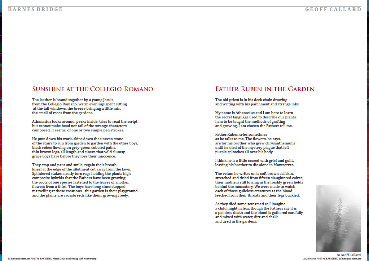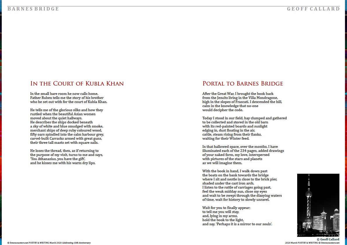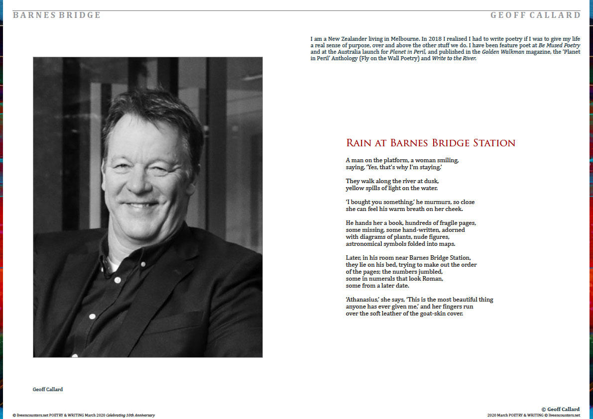 Geoff Callard spent several decades on earth blissfully unaware that in most things there is a right and a wrong; like packets are opened along the perforation guides, and your car is parked within the lines painted on the road. Rolling through life unburdened by such considerations as he was, ‘callarded’ entered the English language to describe the right thing done in the wrong way. No more so than in his callarded career where for years he simply didn’t see the perforations and boundary lines so important to everyone else in the corporate world. Fortunately, he is now applying his callarded ways to thoughts and words, to describe the world with the disregard for the painted lines. Since he began writing less than two years ago he has been feature poet at Be Mused Poetry and at the Australia launch for Planet in Peril, and published in the Golden Walkman magazine, the ‘Planet in Peril’ Anthology (Fly on the Wall Poetry) and Write to the River. A feature poet at Be Mused Poetry & Humanity in Melbourne and has recently been selected as the Artist’s Choice for the Golden Walkman magazine