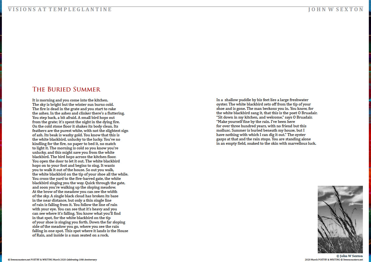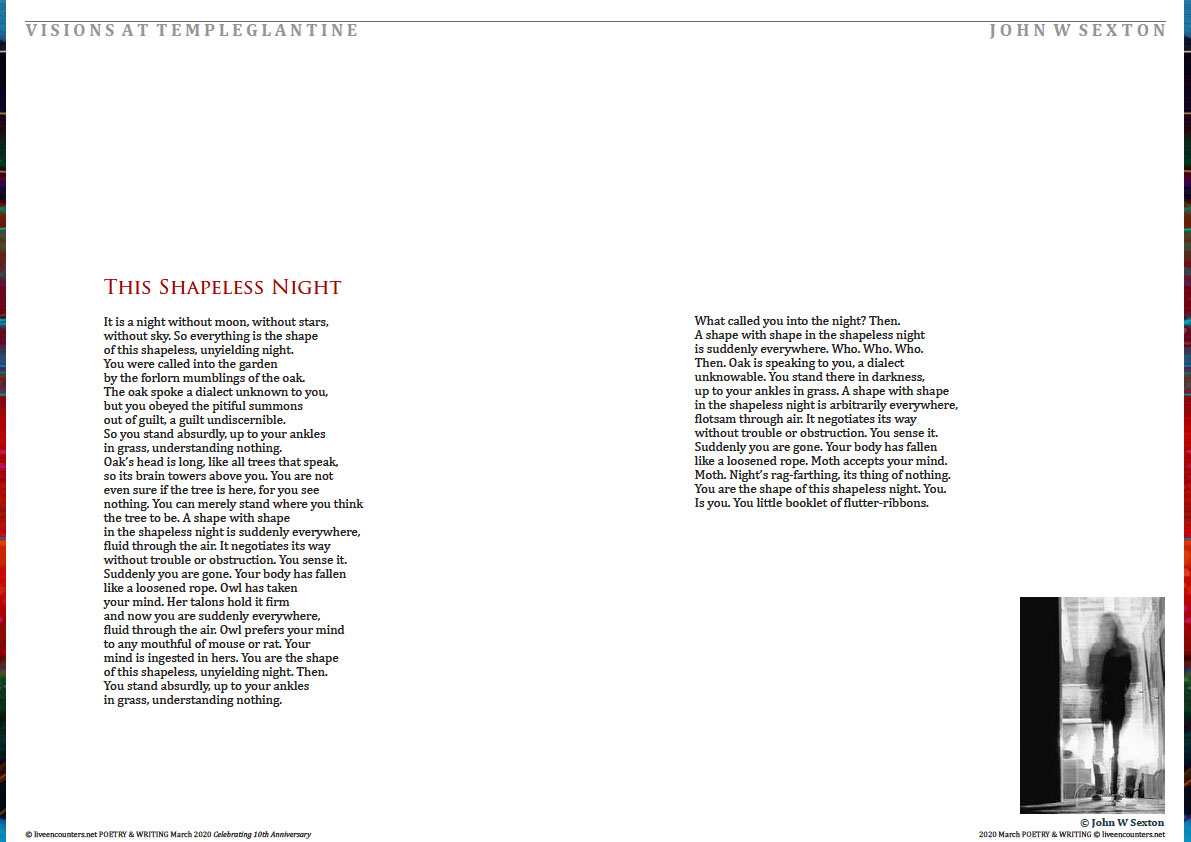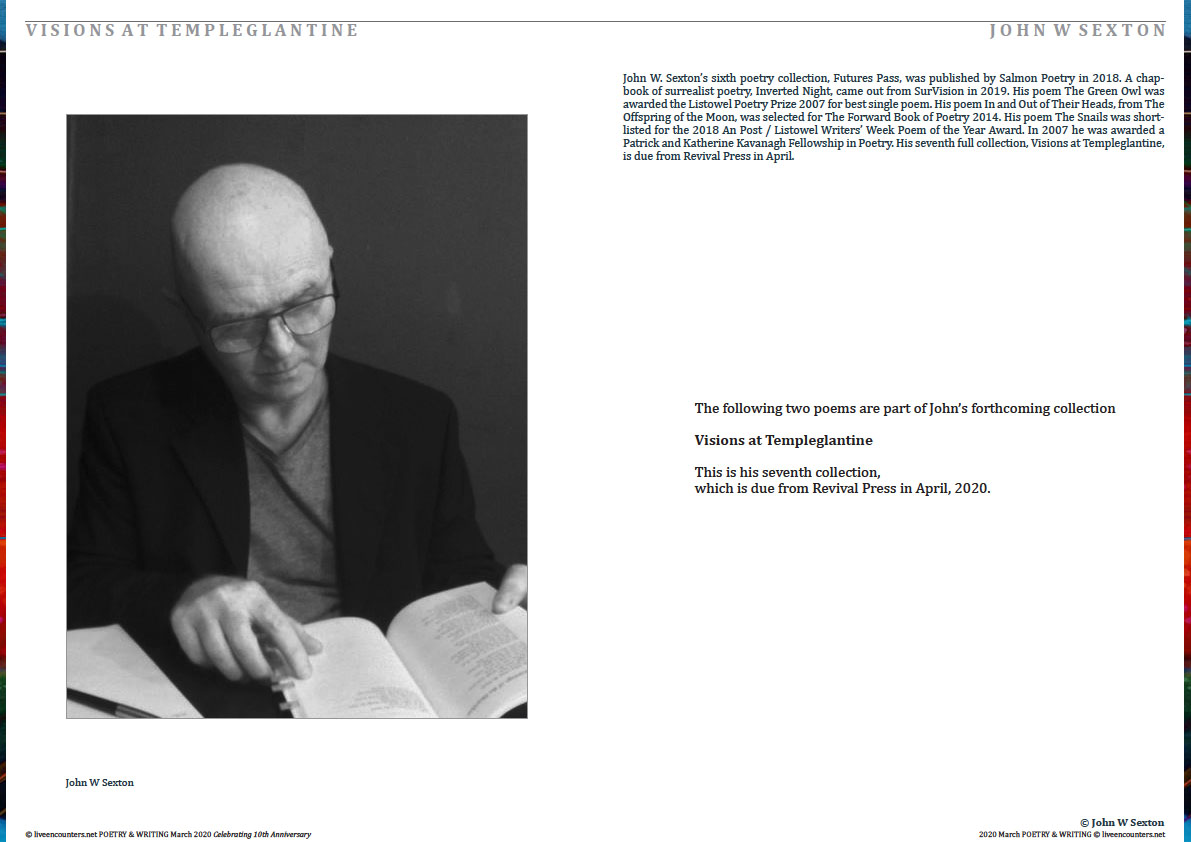 John W. Sexton’s sixth poetry collection, Futures Pass, was published by Salmon Poetry in 2018. A chapbook of surrealist poetry, Inverted Night, came out from SurVision in April 2019. His poem The Green Owl was awarded the Listowel Poetry Prize 2007 for best single poem. His poem In and Out of Their Heads, from The Offspring of the Moon, was selected for The Forward Book of Poetry 2014. His poem The Snails was shortlisted for the 2018 An Post / Listowel Writers’ Week Poem of the Year Award. In 2007 he was awarded a Patrick and Katherine Kavanagh Fellowship in Poetry. His seventh full collection, Visions at Templeglantine, is due from Revival Press in April.
