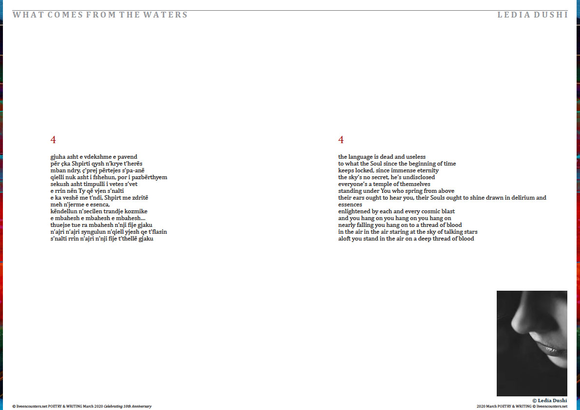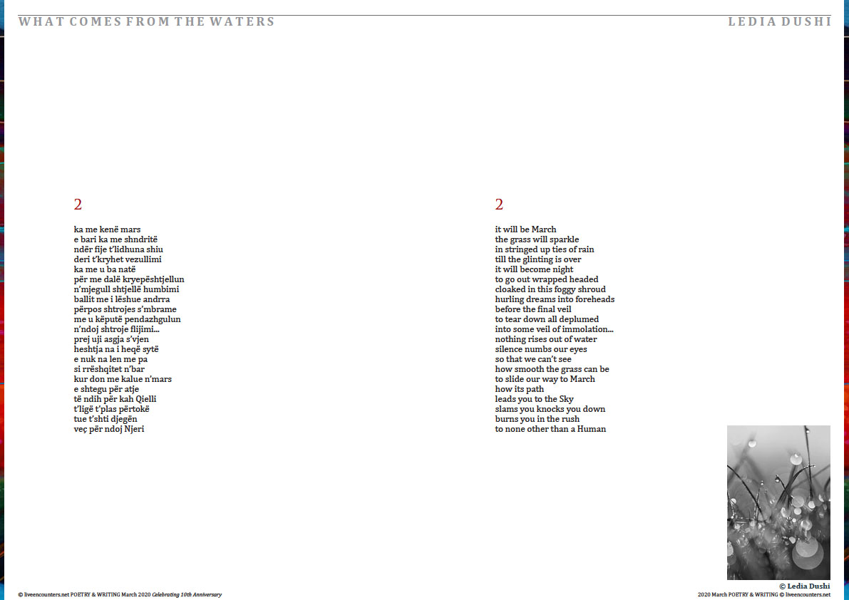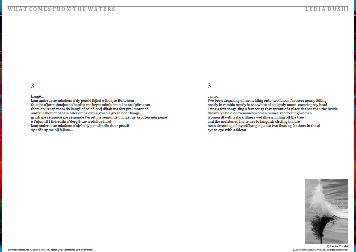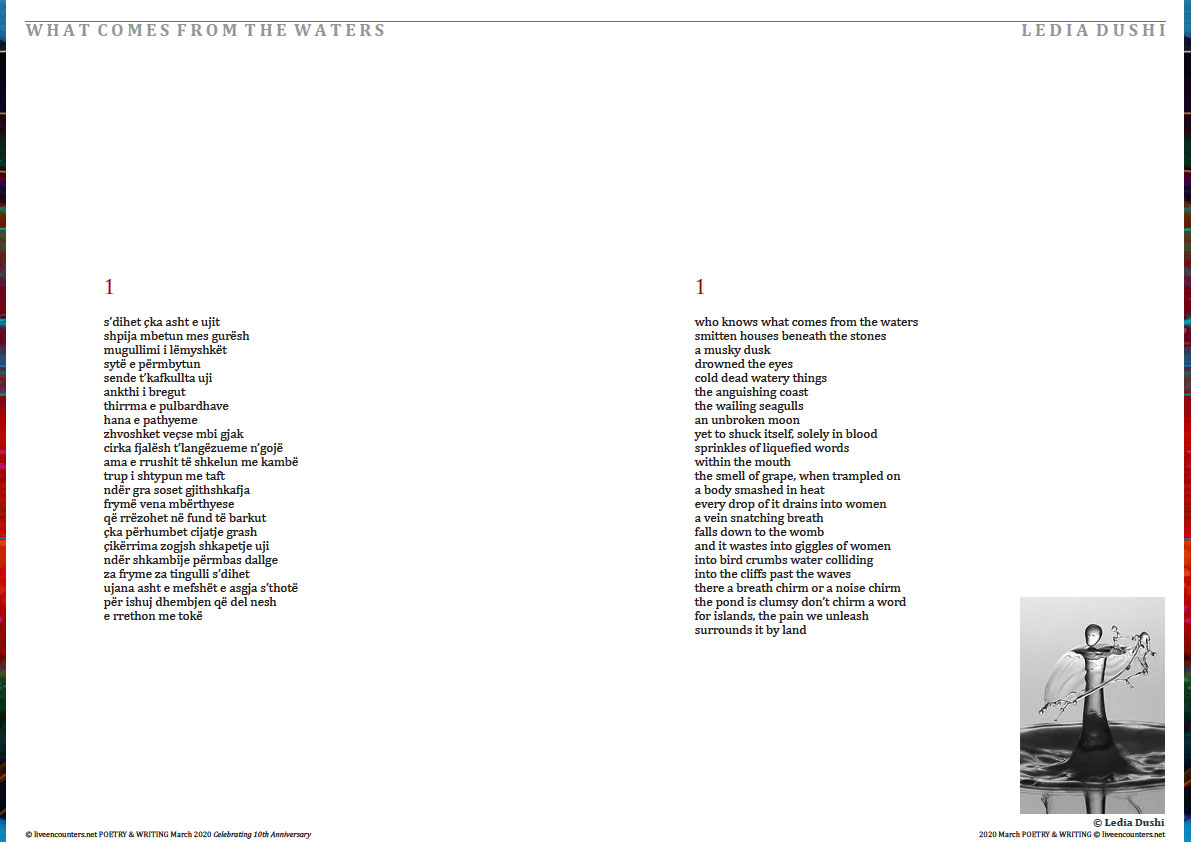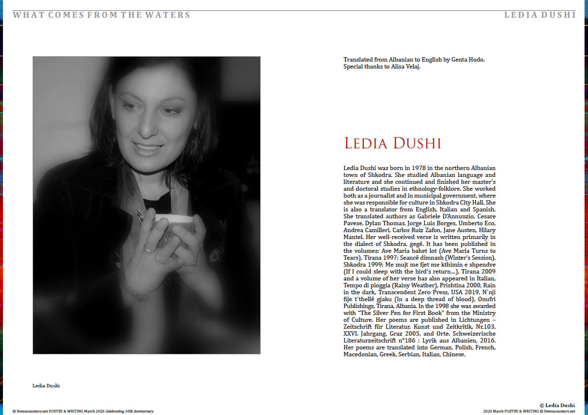Ledia Dushi was born in 1978 in the northern Albanian town of Shkodra. She studied Albanian language and literature and she continued and finished her master’s and doctoral studies in ethnology-folklore. She worked both as a journalist and in municipal government, where she was responsible for culture in Shkodra City Hall. Then she worked at the University of Beograd as a lecturer for Albanian language and literature. During the last year she worked as a lecturer at the European University of Tirana. She is also a translator from English, Italian and Spanish. She translated authors as Gabriele D’Annunzio, Cesare Pavese, Dylan Thomas, Jorge Luis Borges, Umberto Eco, Andrea Camilleri, Carlos Ruiz Zafon, Jane Austen, Hilary Mantel. Her well-received verse is written primarily in the dialect of Shkodra, gegë. It has been published in the volumes: Ave Maria bahet lot (Ave Maria Turns to Tears), Tirana 1997; Seancë dimnash (Winter’s Session), Shkodra 1999; Me mujt me fjet me kthimin e shpendve (If I could sleep with the bird’s return…), Tirana 2009 and a volume of her verse has also appeared in Italian, Tempo di pioggia (Rainy Weather), Prishtina 2000, Rain in the dark, Transcendent Zero Press, USA 2019, N`nji fije t`thellë gjaku (In a deep thread of blood), Onufri Publishings, Tirana, Albania. In the 1998 she was awarded with “The Silver Pen for First Book” from the Ministry of Culture. Her poems are published in Lichtungen – Zeitschrift für Literatur, Kunst und Zeitkritik, Nr.103, XXVI. Jahrgang, Graz 2005, and Orte. Schweizerische Literaturzeitschrift n°186 : Lyrik aus Albanien, 2016. She also participated with readings in Leipzig Book Fair 2011 and Frankfurt Book Fair in 2006. She was invited in Literariches Colloquium in Berlin, Germany (2004) and in Internationales Haus der Autorinnen und Autoren, Graz, Austria 2005. Her poems are translated into German, Polish, French, Macedonian, Greek, Serbian, Italian, Chinese.