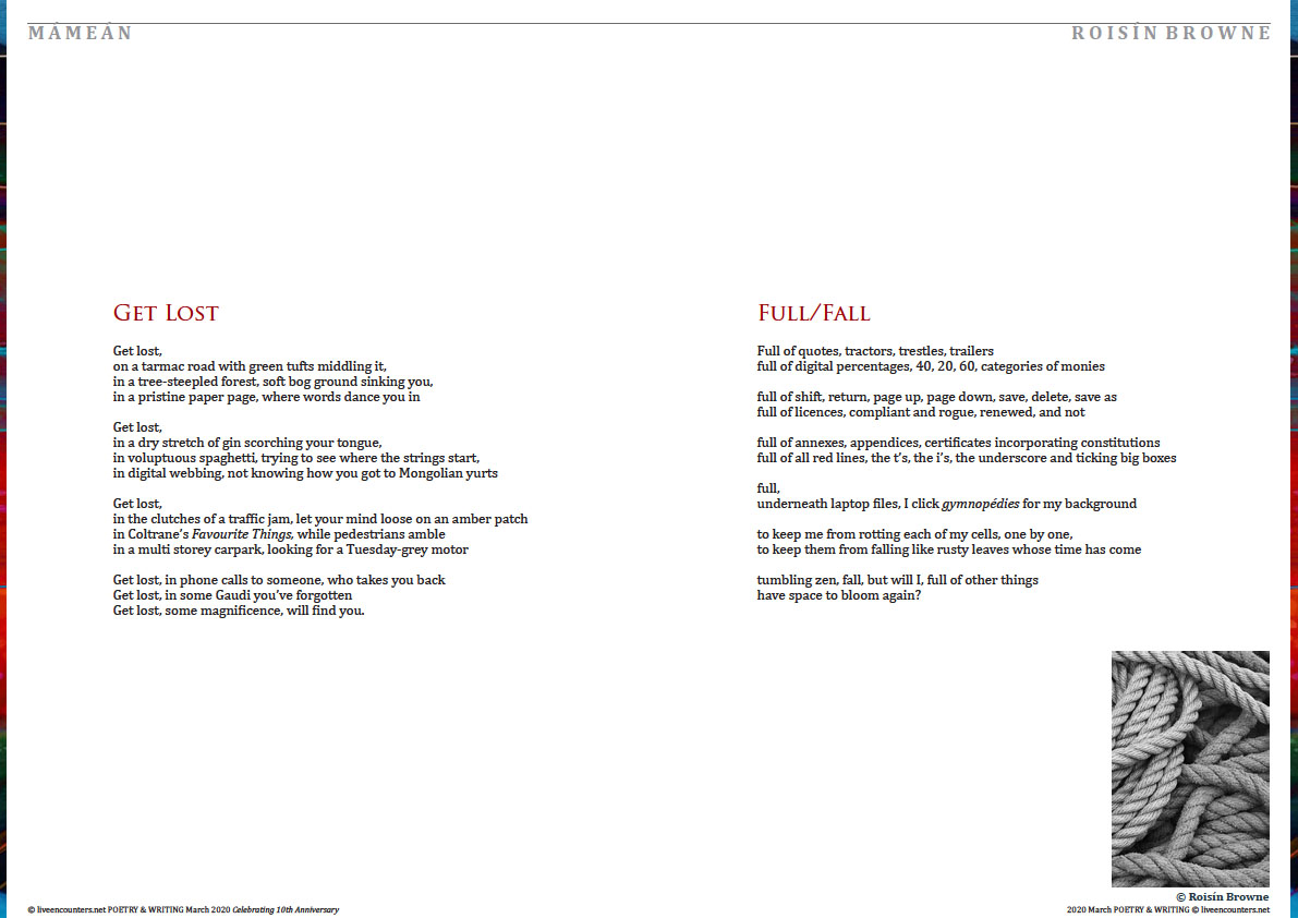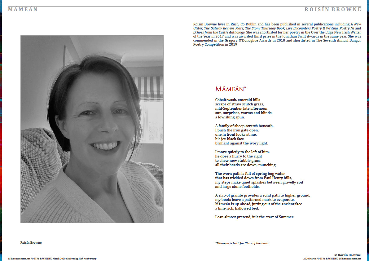 Roisín Browne lives in Rush, Co Dublin and has been published in several publications including A New Ulster, The Galway Review, Flare, The Stony Thursday Book, Live Encounters Poetry & Writing, Poetry NI and Echoes from the Castle Anthology. She was shortlisted for her poetry in the Over the Edge New Irish Writer of the Year in 2017 and was awarded third prize in the Jonathan Swift Awards in the same year. She was commended in the Gregory O’Donoghue Awards in 2018 and shortlisted in The Seventh Annual Bangor Poetry Competition in 2019.