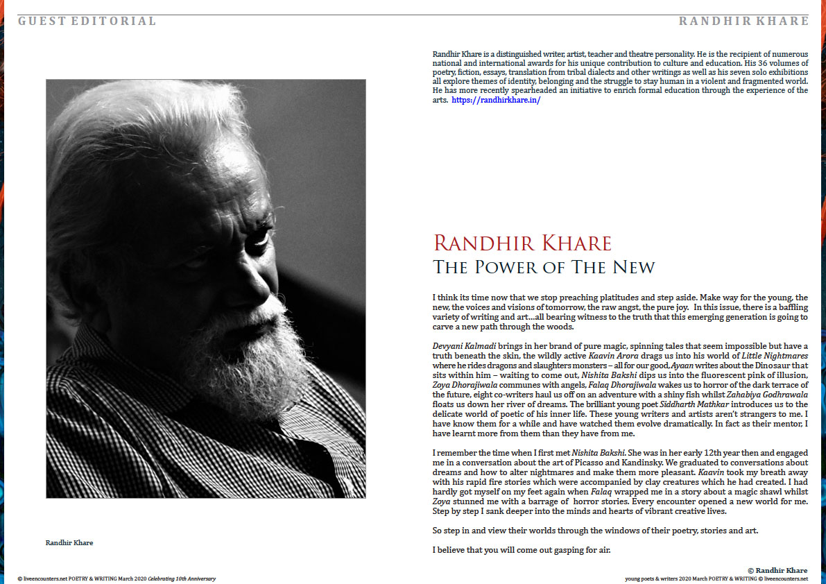 Randhir Khare is an award winning poet, artist, writer, playwright, folklorist and distinguished educationist who has published thirty-six volumes of poetry, short fiction, essays, novels and educational handbooks and has travelled widely, reading and presenting his work, nationally and internationally. He has presented his work at the Nehru Centre in London, at the Ubud Writers Festival in Bali, the India Festival In Bulgaria, at the Writers Union in the Czech Republic, in Bulgaria, Slovenia, the Pune International Literary Festival and at the Europalia Arts Festival in Belgium. In India, he has performed his poetry with various traditional and contemporary musicians and founded  (as well as leads) two poetry-music bands : MYSTIC and AFTER RUMI. Over the last year  he has published two path-breaking volumes of poetry and drawings, MOUNTAINS OF MY SILENCE and MEMORY LAND,  He is the recipient of The Sanskriti Award for Creative Writing, The Gold Medal for Poetry awarded by the Union of Bulgarian Writers, The Human Rights Award, The Residency Grant 2009 for his  lifetime contribution to literature in English  awarded by The Sahitya Akademi (The National Akademy Of Letters) and The Palash Award (for his lifetime contribution to education and culture) among others. He has completed four and a half decades of distinguished services to education and special education and founded The RBA Centre For Special Education & The CSE Centre For Children With Special Needs.